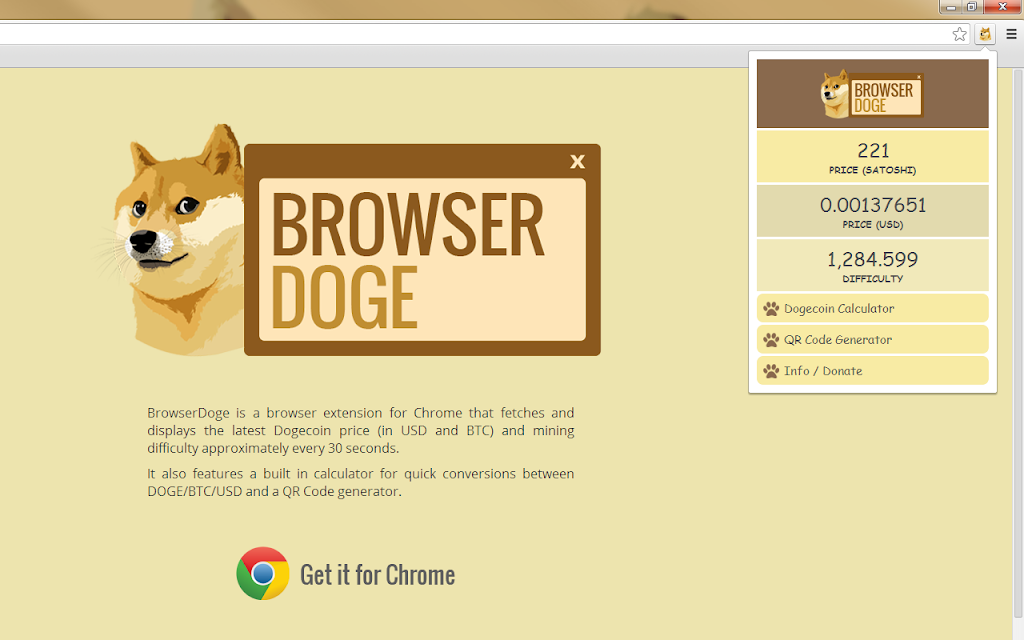It also features a built in calculator for quick conversions between DOGE/BTC/USD and a QR Code generator.