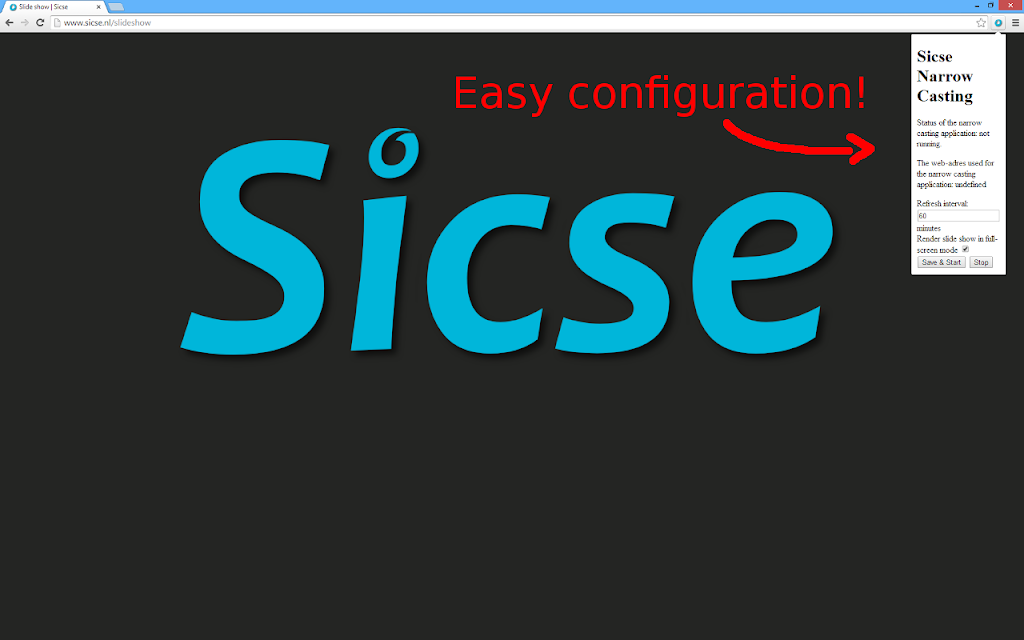 The narrow casting extension can be started (and stopped) using the pop up window that is shown when clicking the browser action. The user is able to configure the refresh interval and specify whether the content should be shown in full screen mode. The pop up window also shows the current status of the narrow casting process.