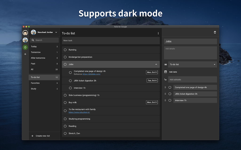 Task display of \"today\", \"tomorrow\", \"the day after tomorrow\", \"overdue\", \"all\", global search, alphabetical or date sorting and dark mode support!