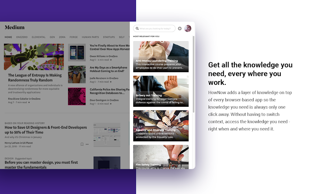Whether you’re in your CRM or in your Inbox, install the HowNow Chrome Extension and seamlessly add a layer of knowledge to your entire workflow and increase your productivity. Get up-to-date product info, sales collateral, productivity hacks, best practices, onboarding manuals and more, without spending time searching and switching context.