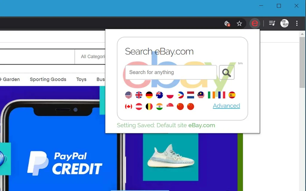 While set to eBay.com by default, just click your country flag for the extension to remember your country selection. So when you search, its your local eBay site.