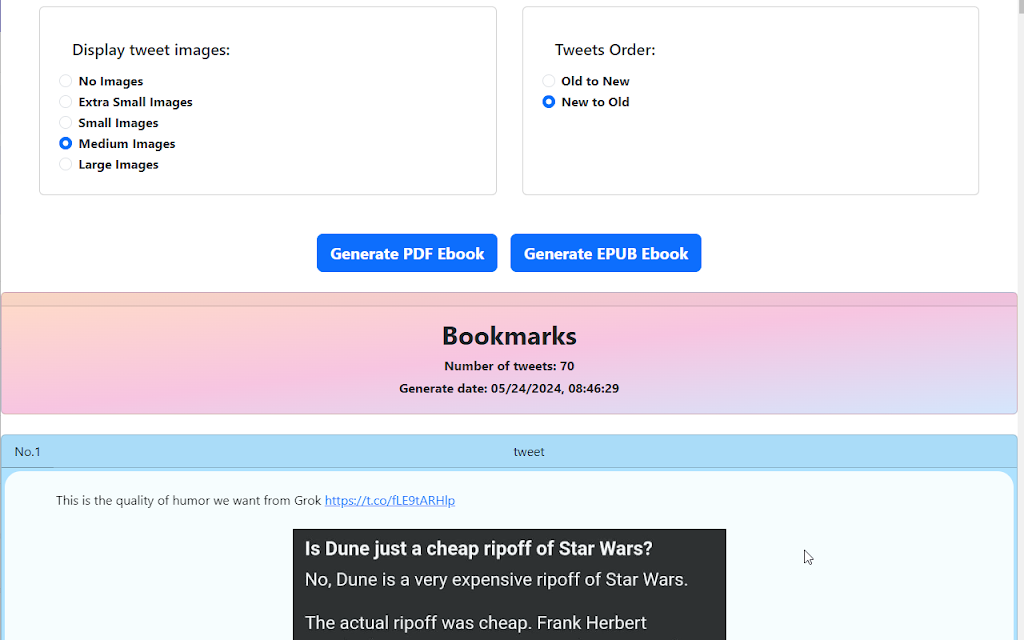 Method 2: Download TwBookmarks2Ebook - Create ebook from Twitter Bookmarks extension for Chrome and install in Developer Mode