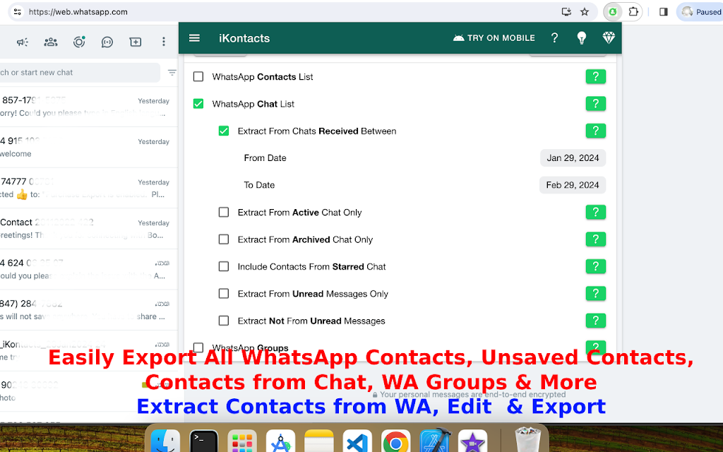 - Utilize iKontacts to export contacts from WhatsApp groups, individual chats, labeled contacts, or blocked contacts.