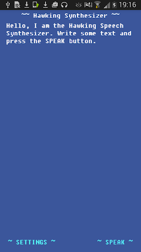 Speech Synthesizer - Hawking steht ganz oben auf der Liste der Unterhaltung Kategorie-Apps im Google Playstore. Es hat wirklich gute Bewertungspunkte und Rezensionen. Zur Zeit, Speech Synthesizer - Hawking für Windows ist überstanden App Installationen and 3.7 Stern durchschnittliche aggregierte Nutzerbewertungspunkte.