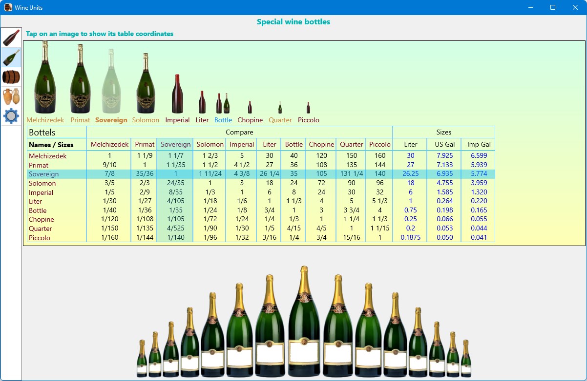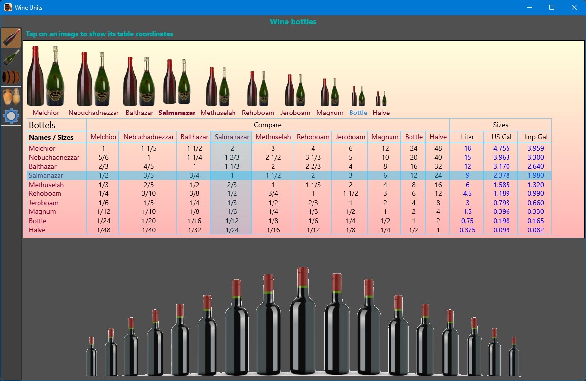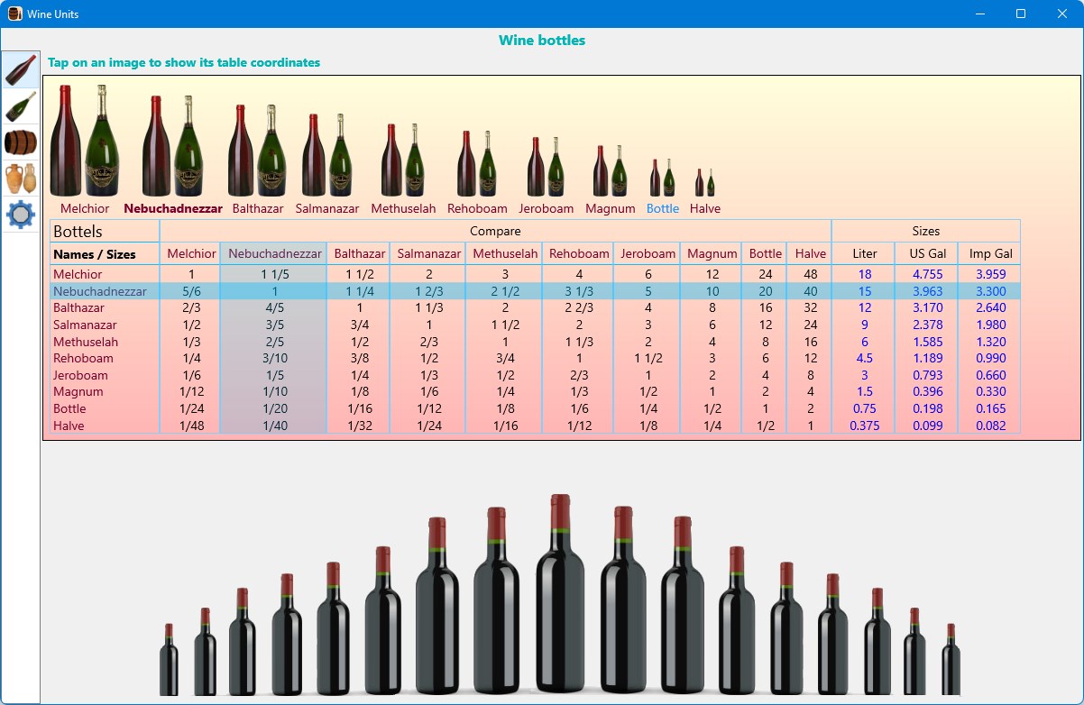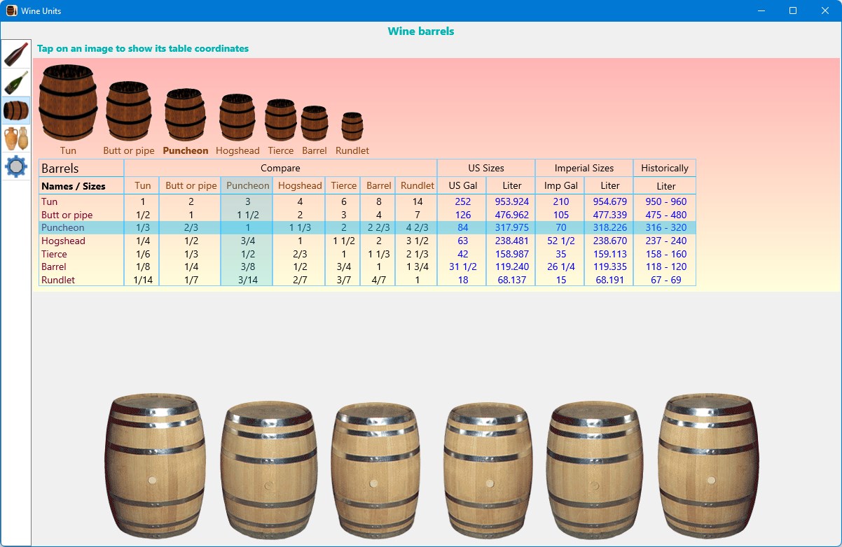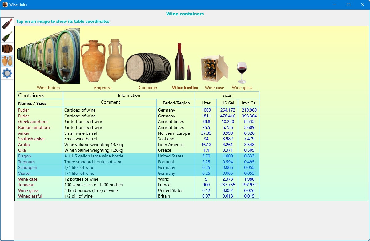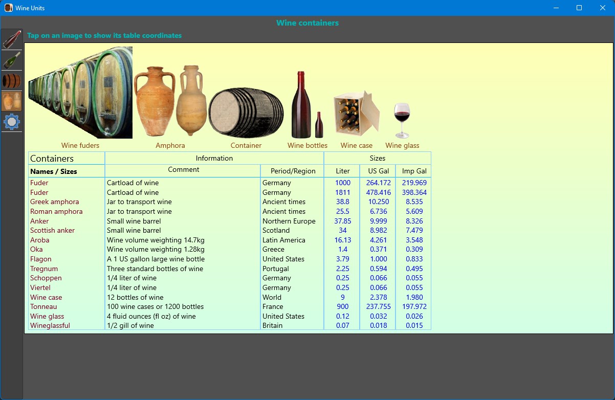 Over the centuries, people kept wine in different containers: amphorae, barrels, bottles, cases, etc. They also gave them names and used different sizes. This app displays four groups of wine containers and their names: regular bottle sizes, unusual bottle sizes, barrel sizes and different other containers. Within each group, the app compares the bottles, barrels or containers are compared against each other and gives their volume in liter, US gal and Imp gal.