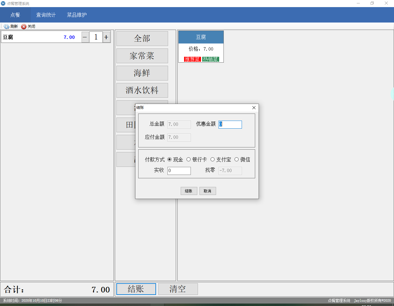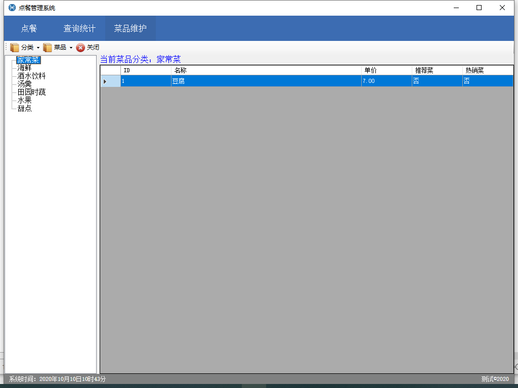 这是一款简单的点餐管理系统。能够维护菜品分类、菜品、点餐及每日汇总统计