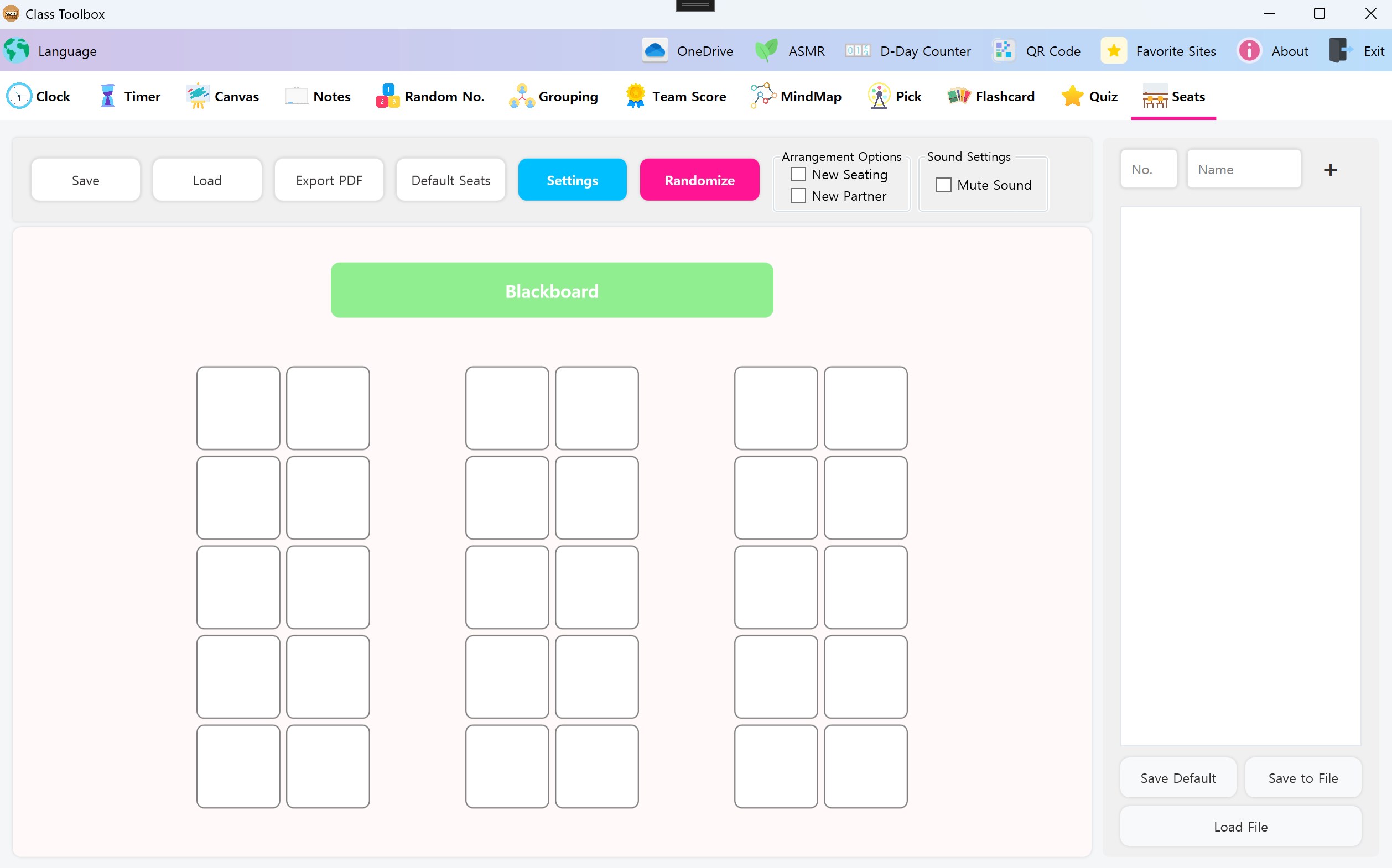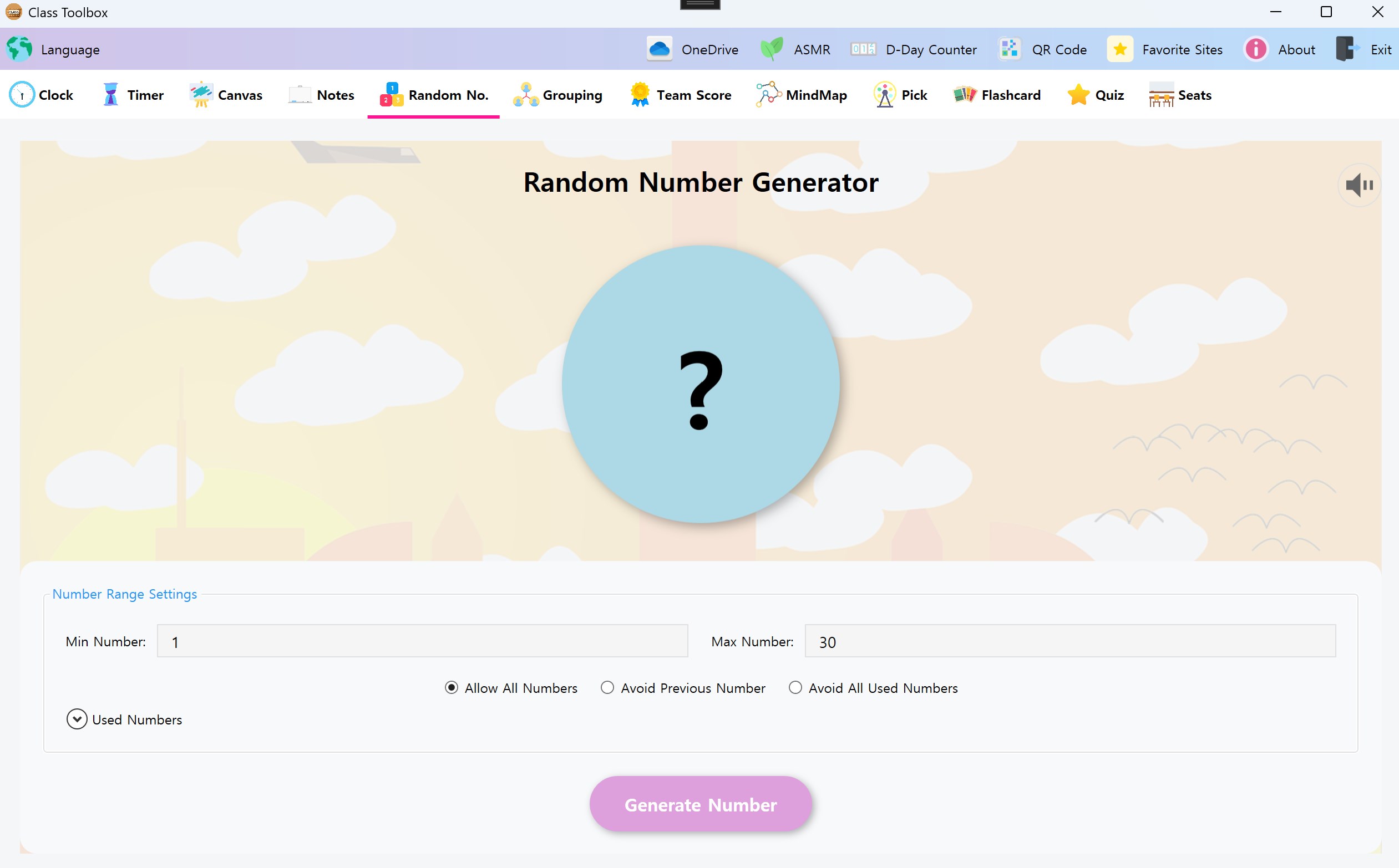 Easily access various tools needed in the classroom, all within a single program. From clocks, timers, canvases, and whiteboards to random number draws, group assignments, and seating arrangements, this program offers a wide range of features for your lessons.