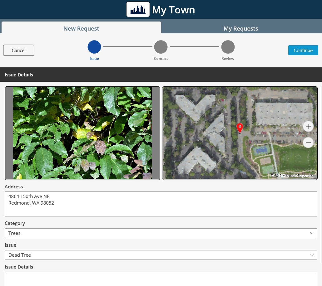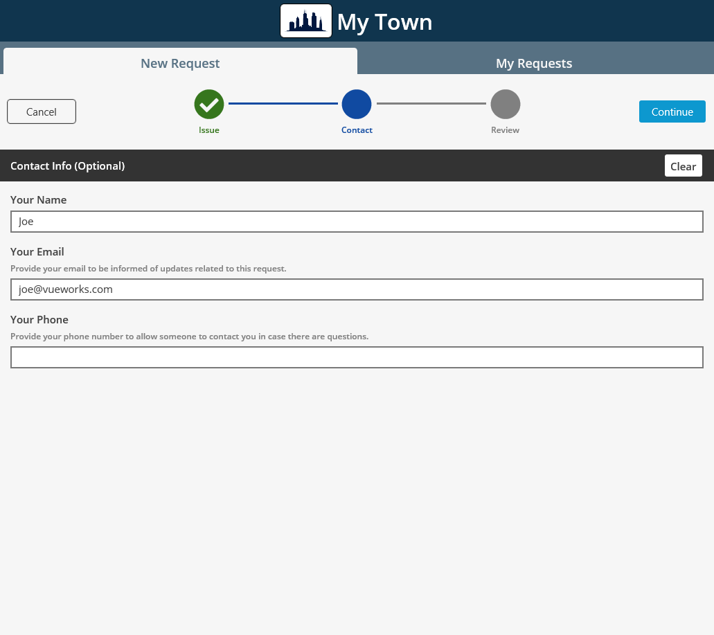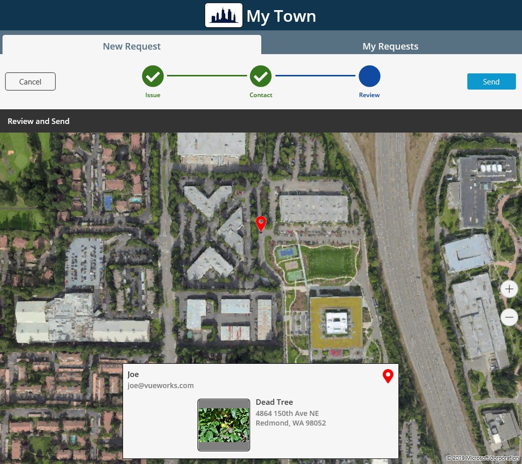 Promotes community involvementSubmit a local service requestGeospatial referencingInclude notes and detailsAttach photos/documentsRequest tracking by email (optional)Feeds directly into VUEWorks asset management software