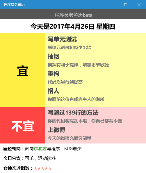 ·本老黄历内容是程序生成的,因为只有这样程序员才会信。