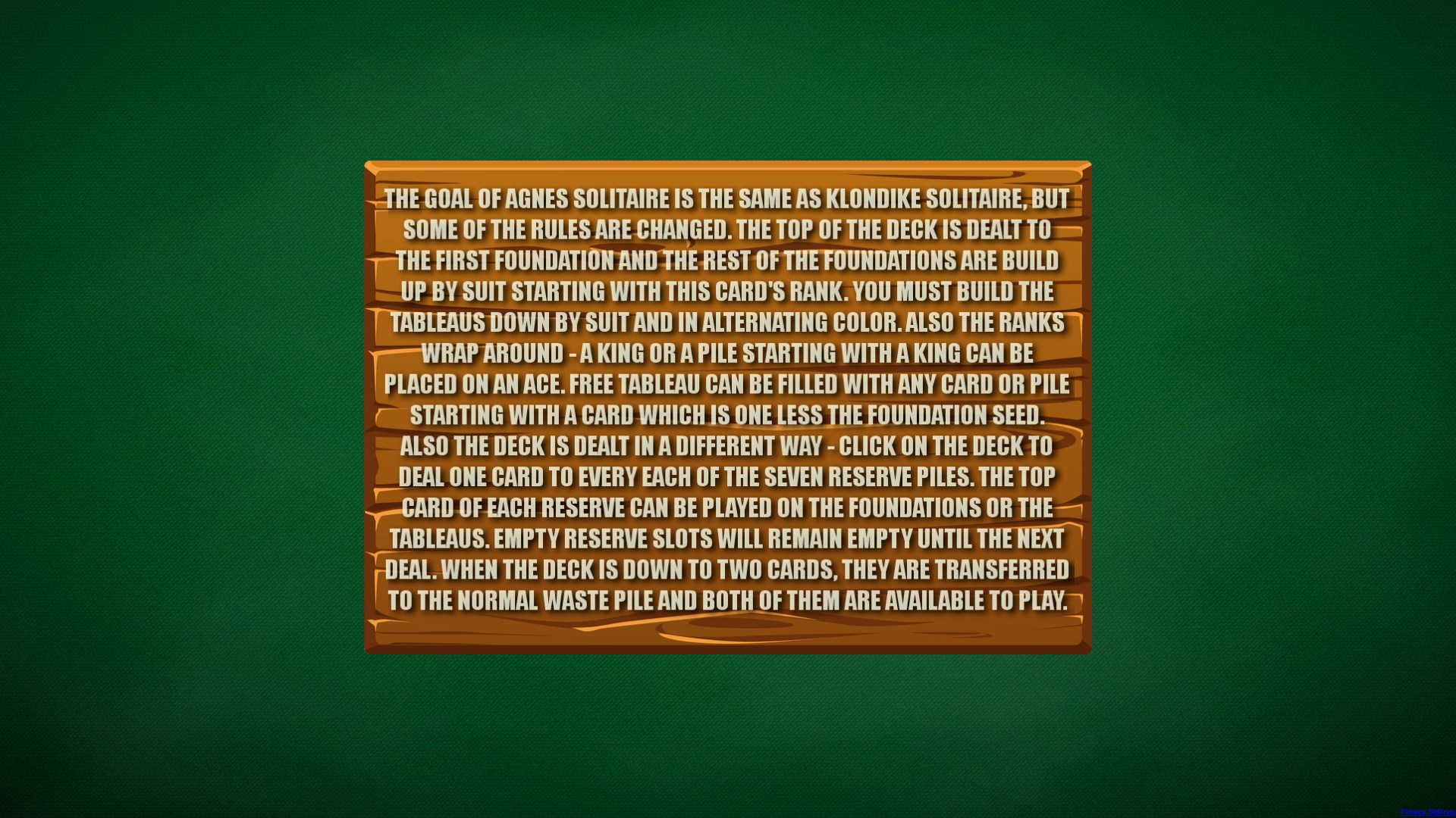 The classic solitaire game Agnes Solitaire. Based on Klondike Solitaire, but with some rules changed - this makes it one great solitaire solving game!