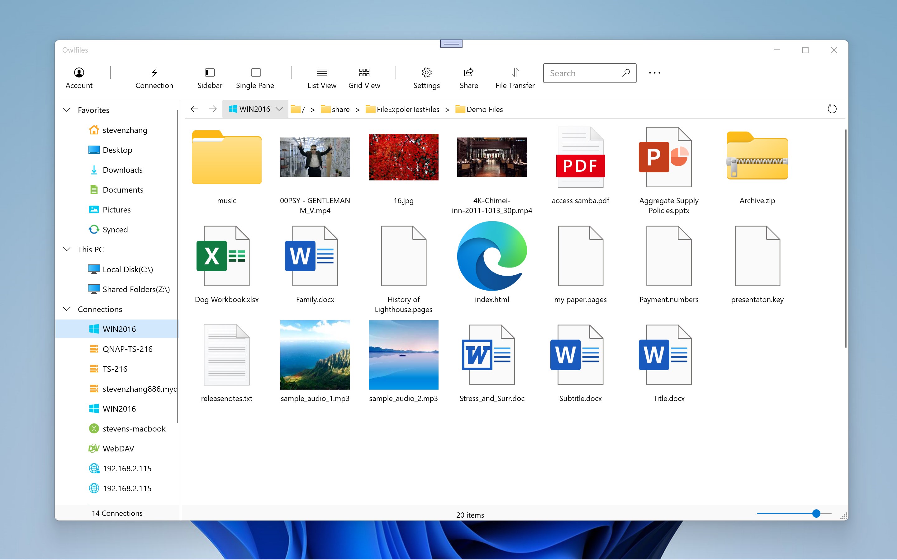 Owlfiles is a powerful file management app on mobile platforms and desktop platforms. It can access not only files on your PC, but also files on your server, NAS and cloud. Stream movies and music to your PC. Directly view and manage documents, photos on your server, NAS and cloud without downloading.