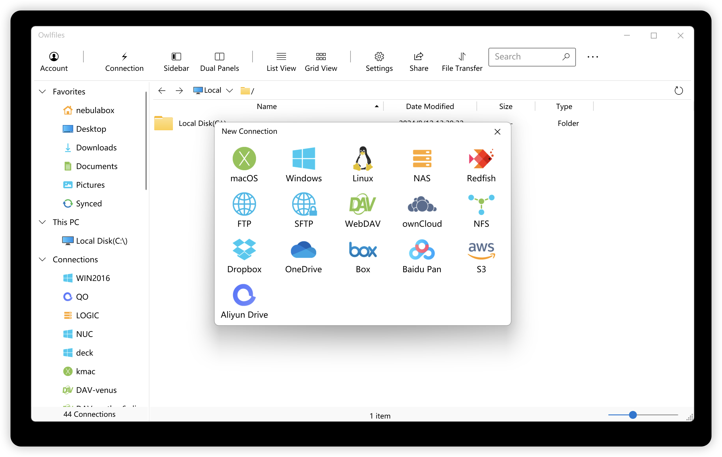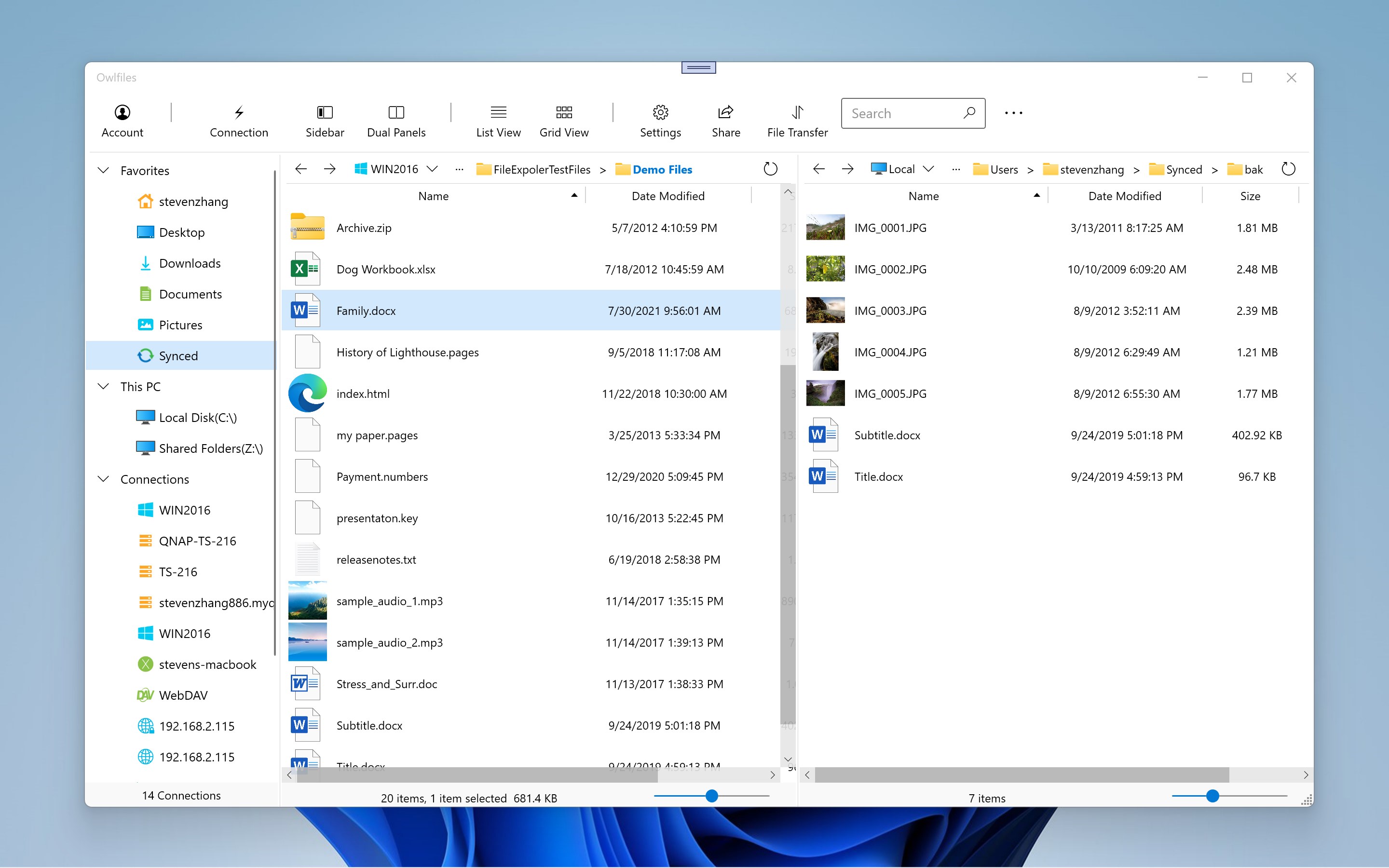 Access network shares on server, NAS via SMB/CIFS protocol.Access WebDAV Server, FTP Server and SFTP Server.Access OwnCloud, Amazon S3, OneDrive, Dropbox etc.Sync files between PC and server/NAS/could.Drag and drop files between dual panes for file transfer.