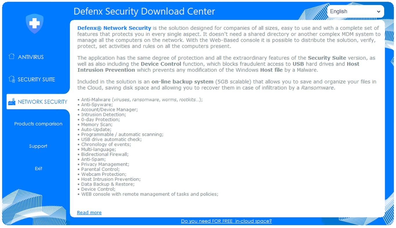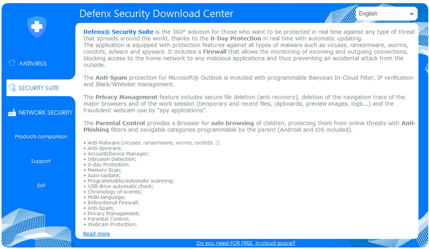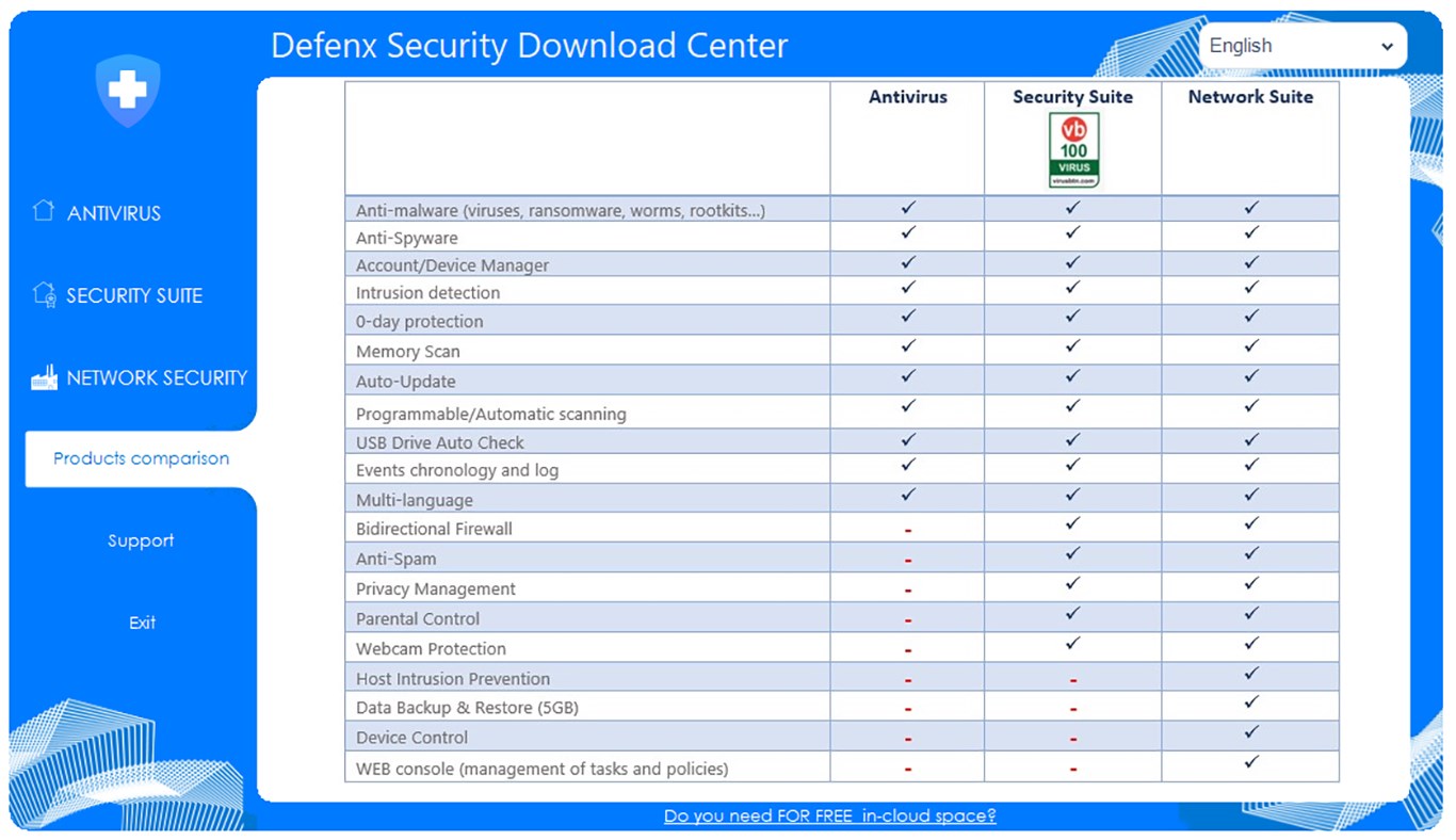 - Defenx Antivirus (info and download)- Defenx Security Suite (info and download)- Defenx Network Security (info and download)- Products Comparison- Support