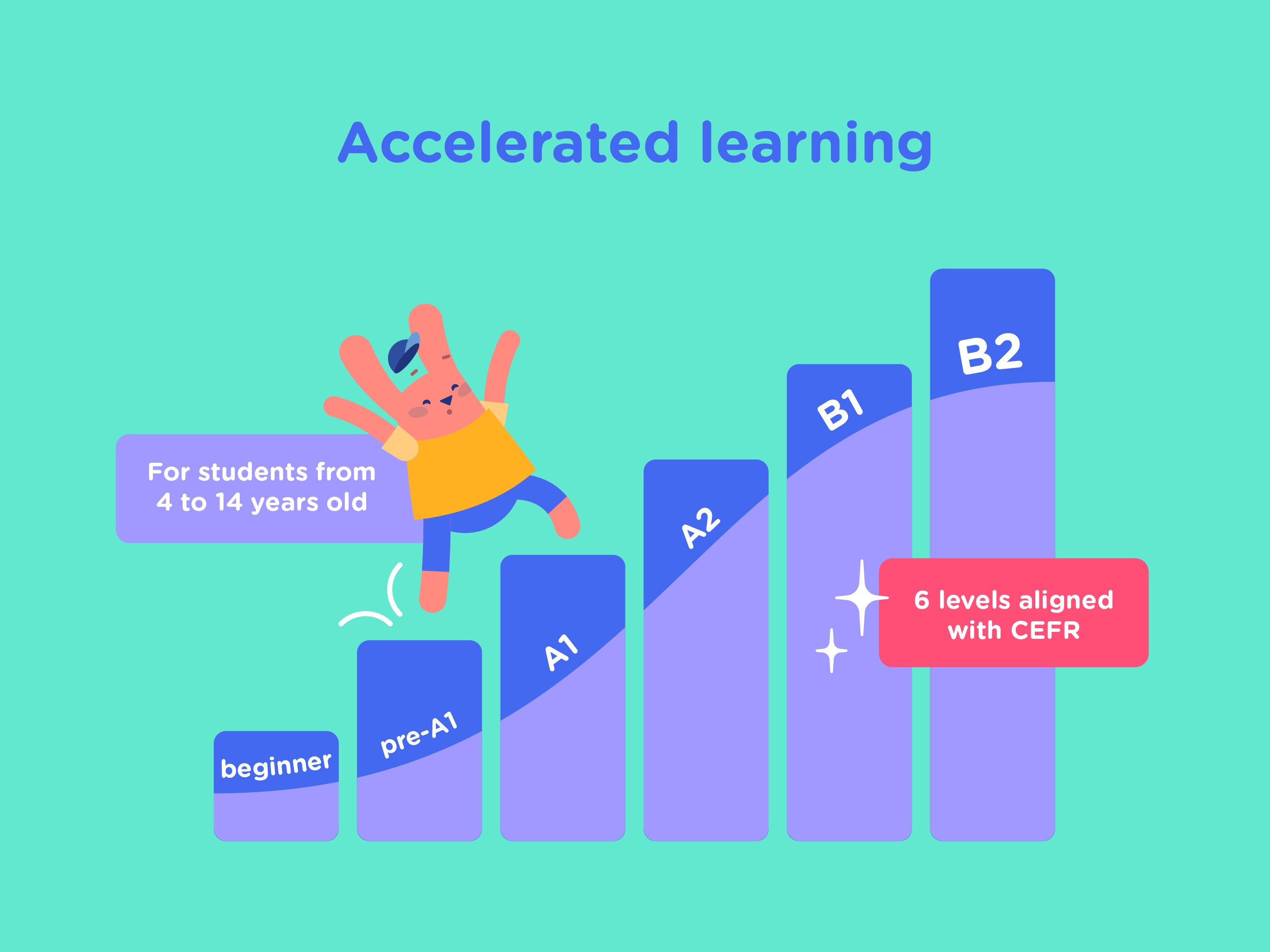 Our educator team selects content from beginner (pre-A1) to intermediate levels (B2) for students from 4 to 14 years old.