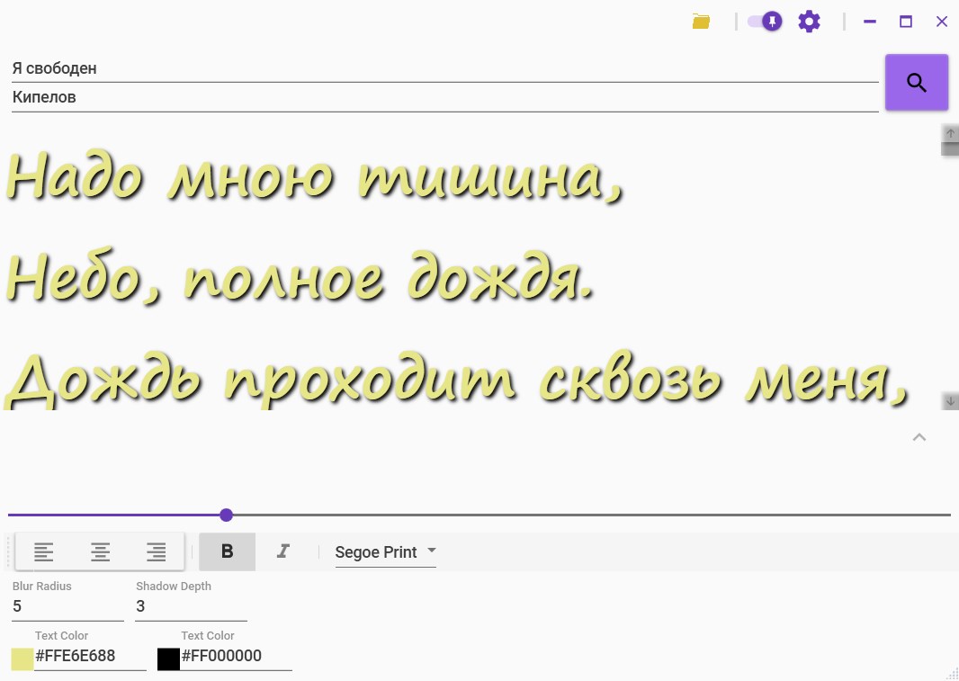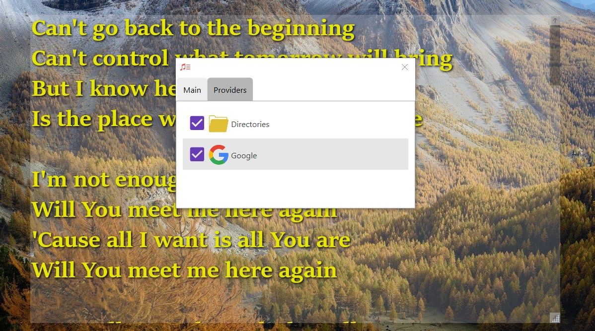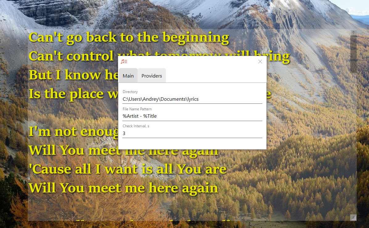 ✓ Detect current song from almost any music player or browser✓ Lyrics searching on Google or in local directory✓ Autosaving found lyrics to text file✓ Display floating lyrics window on topmost✓ Ability to customize text colors, size, and fonts✓ Ability to open lyrics source✓ Option to auto run with system