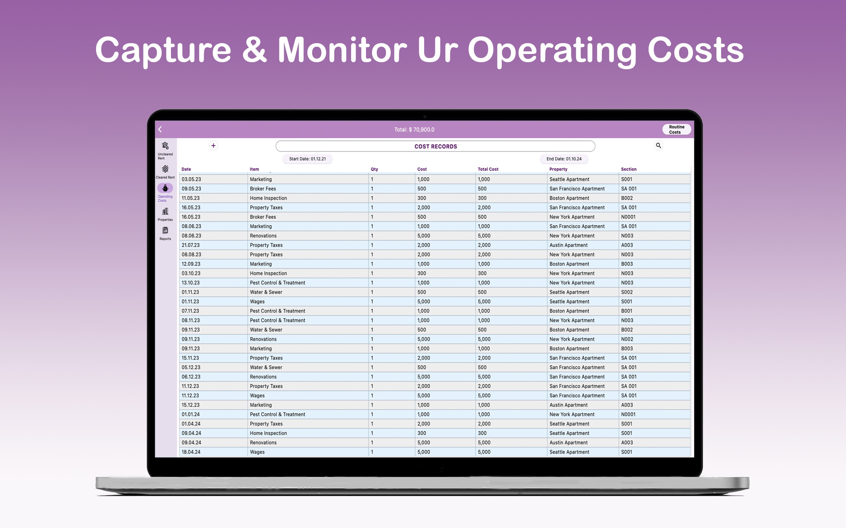 Record and manage expenses, operating costs, and maintenance costs incurred in your property operations.