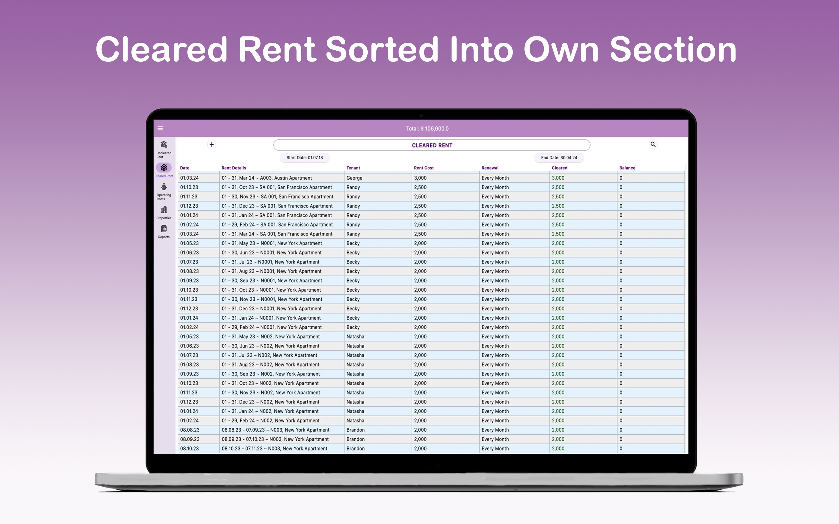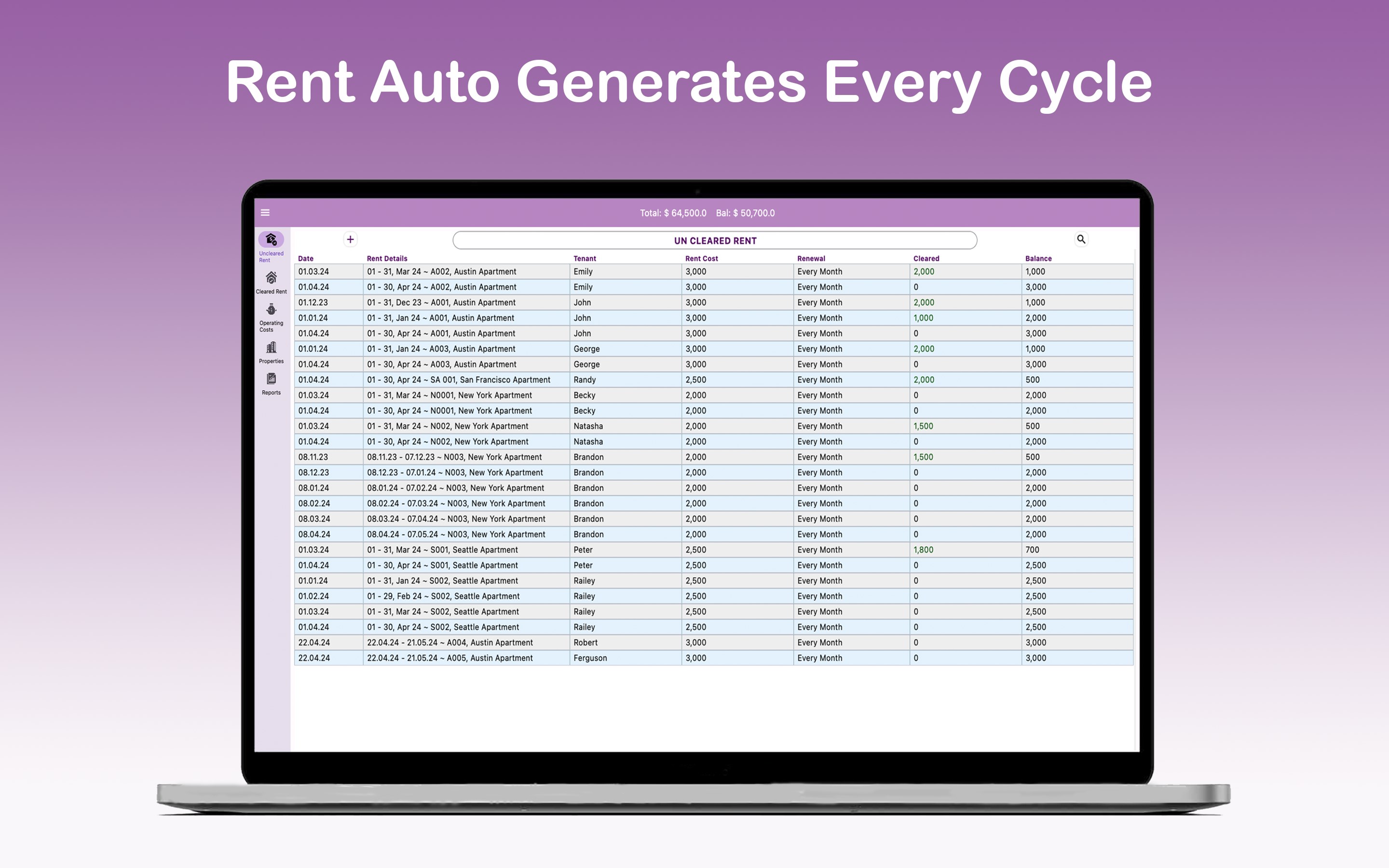 Add rent data manually or let the app automatically generate rent data for all registered tenants every cycle.