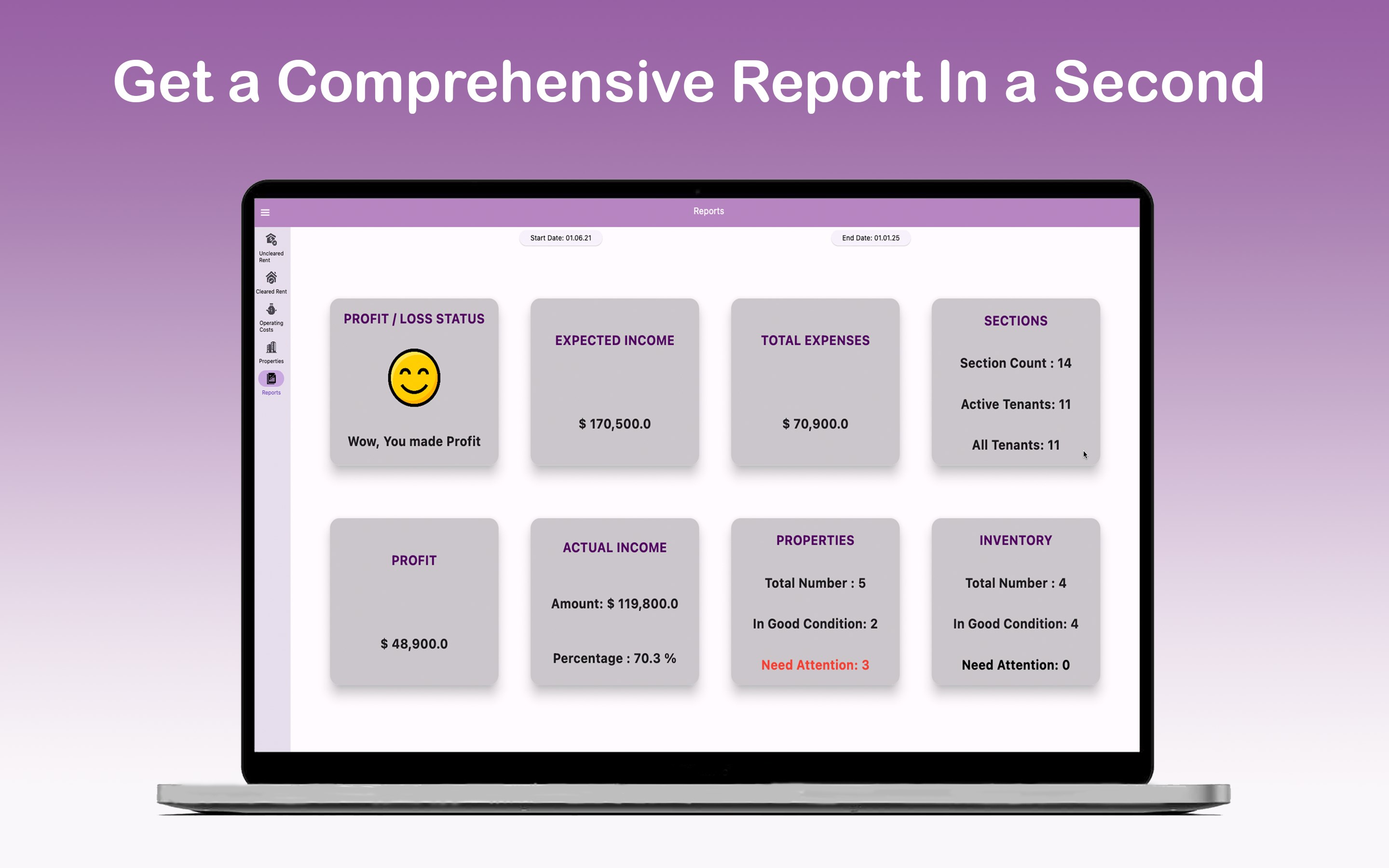Generate comprehensive reports with detailed analysis of all vital information in your data, including profit/loss, expected income, actual income, income percentage collected, total expenses, and property statistics.