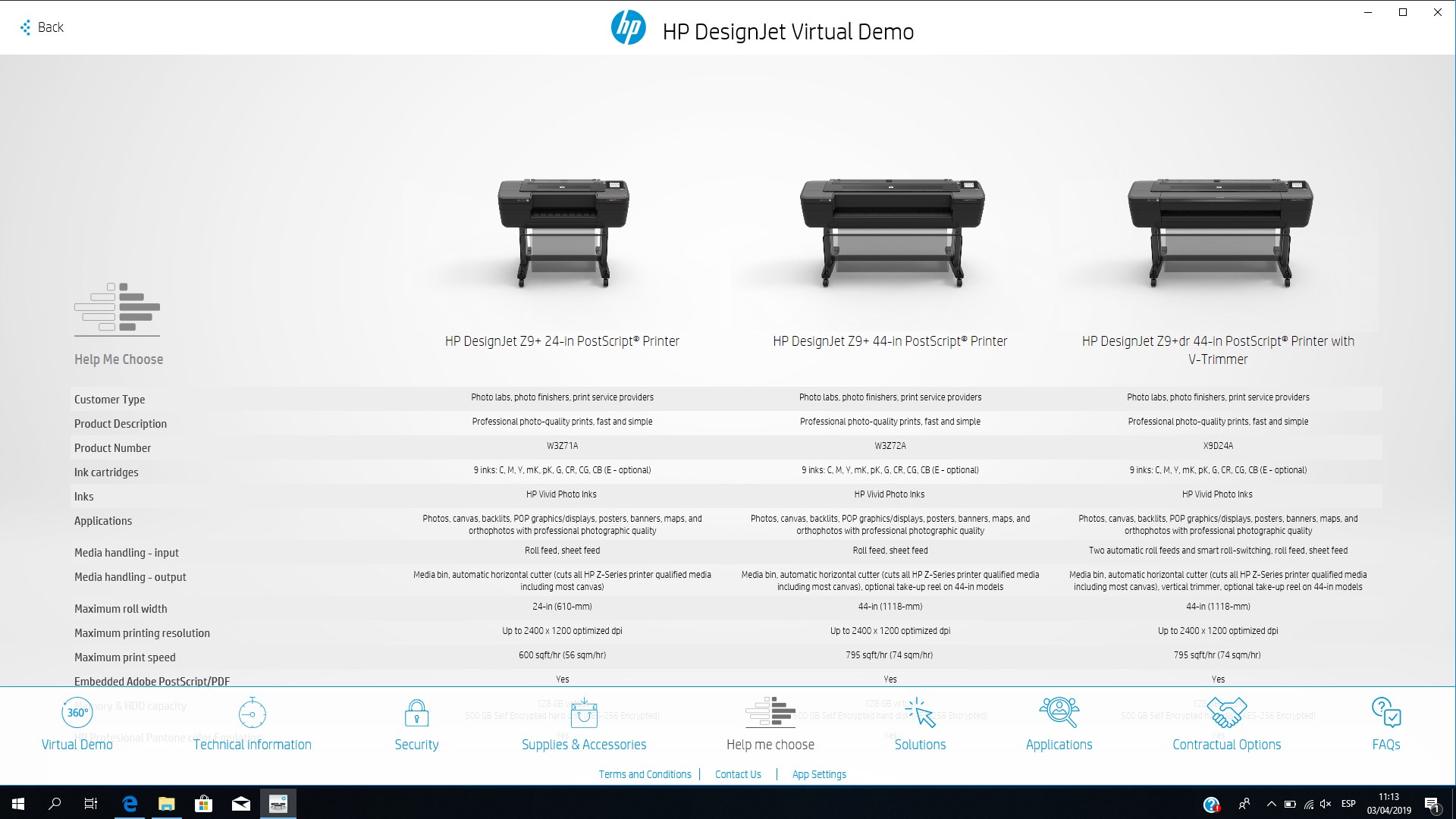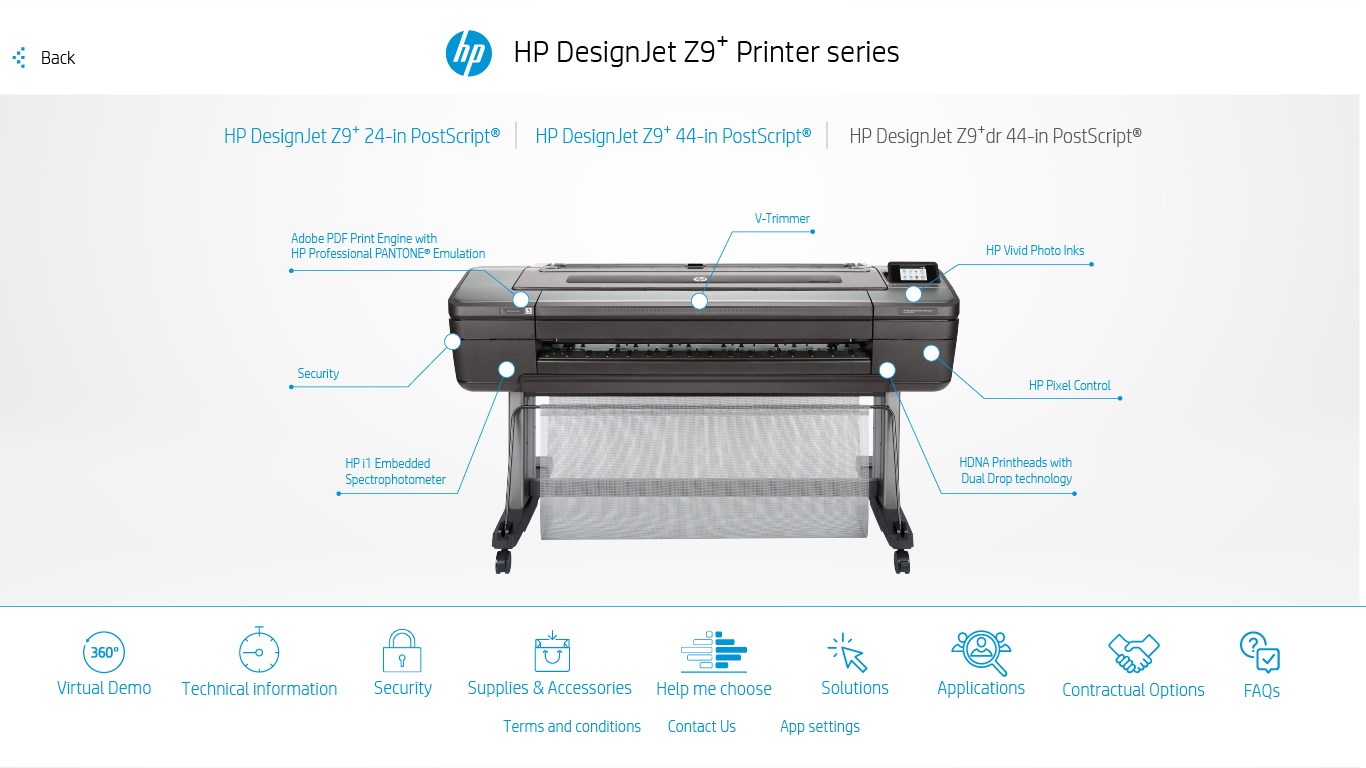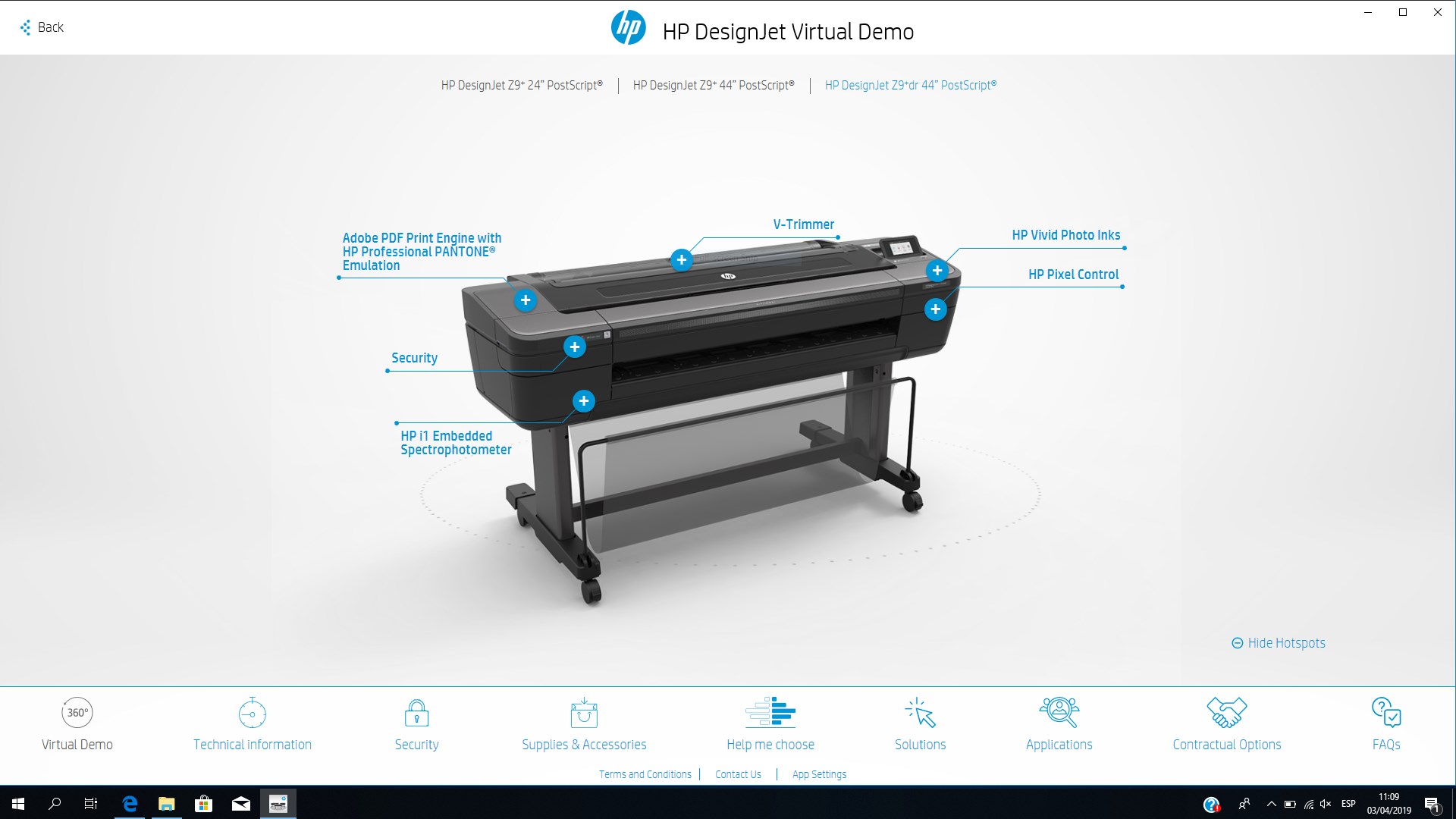 HP DesignJet Virtual Demo is an easy to use sales tool for HP Sales and HP Partners. It has all the information that the sales staff will need for their client visit, providing easy access and a 360ยบ view of the printer which shows the main characteristics of the product, videos, technical data sheets and documentation which is continually updated with the most up-to-date version. With this tool you can compare products in the HP DesignJet family, accessories, catalog of applications, information on HP services and the ability to share valuable information with your client and much more