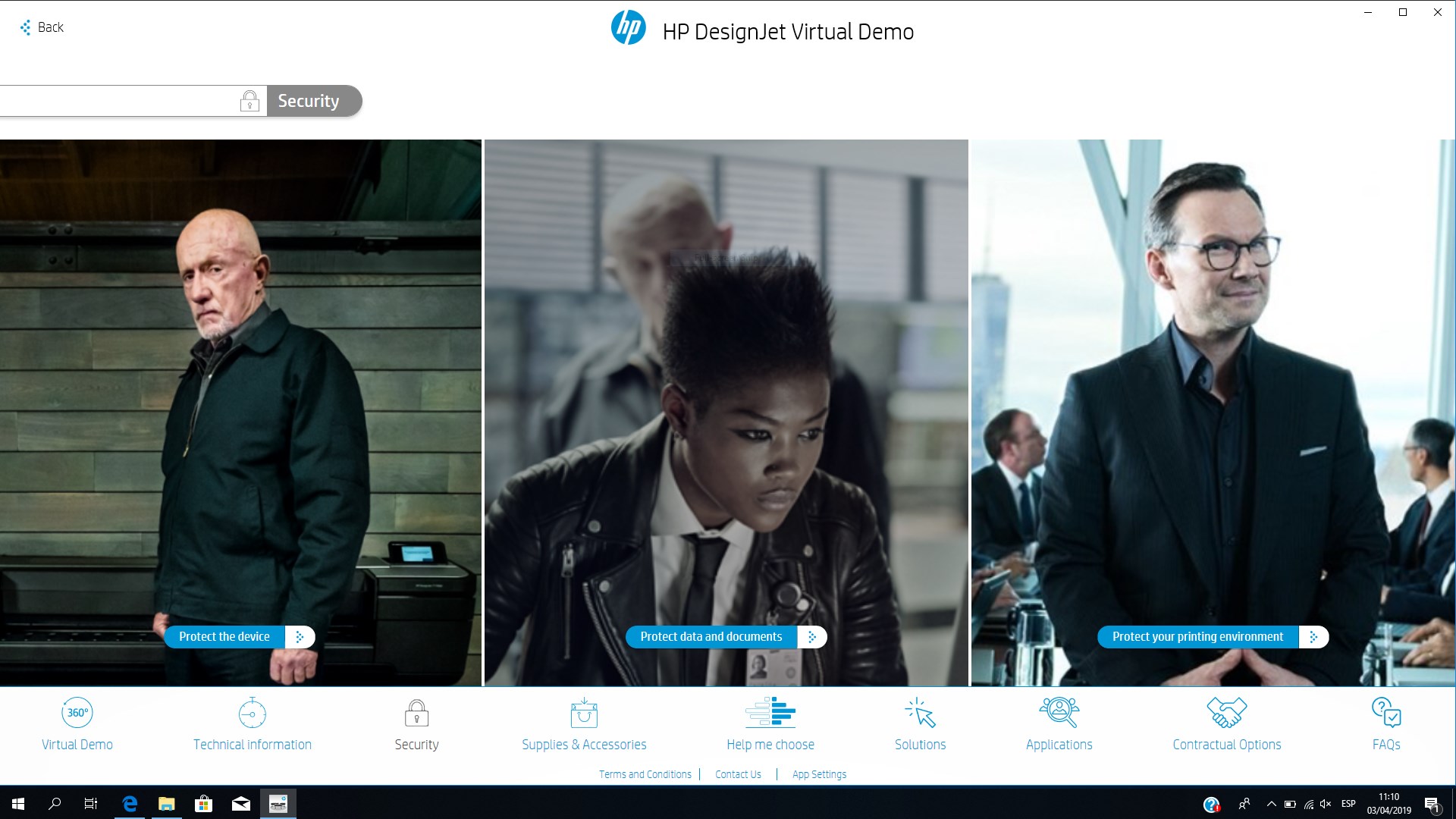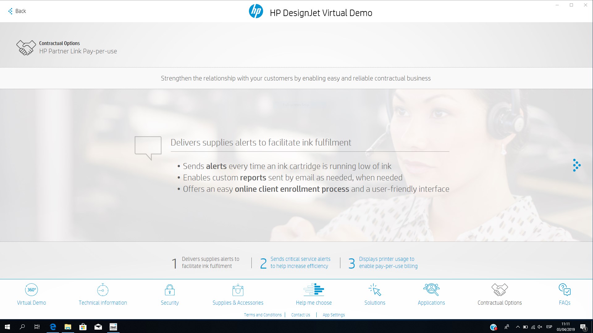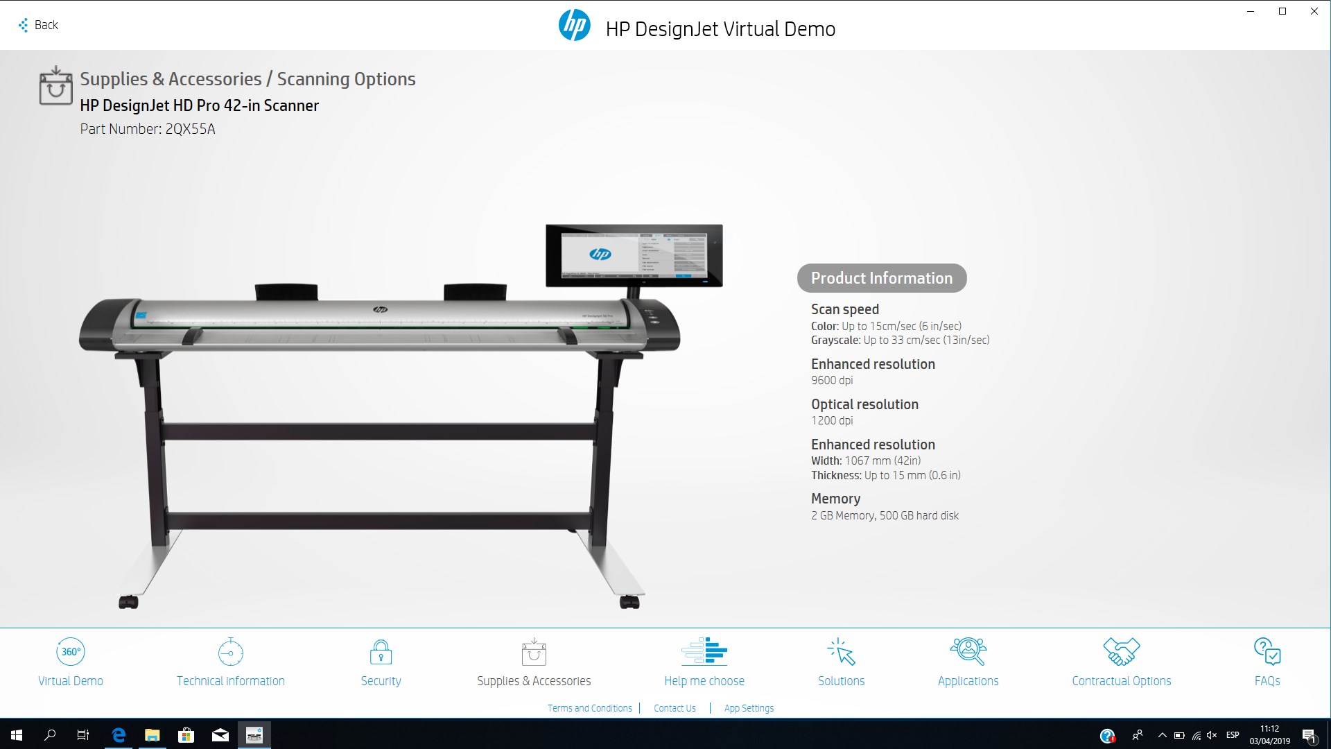 HP DesignJet Virtual Demo is an easy to use sales tool for HP Sales and HP Partners. It has all the information that the sales staff will need for their client visit, providing easy access and a 360ยบ view of the printer which shows the main characteristics of the product, videos, technical data sheets and documentation which is continually updated with the most up-to-date version. With this tool you can compare products in the HP DesignJet family, accessories, catalog of applications, information on HP services and the ability to share valuable information with your client and much more