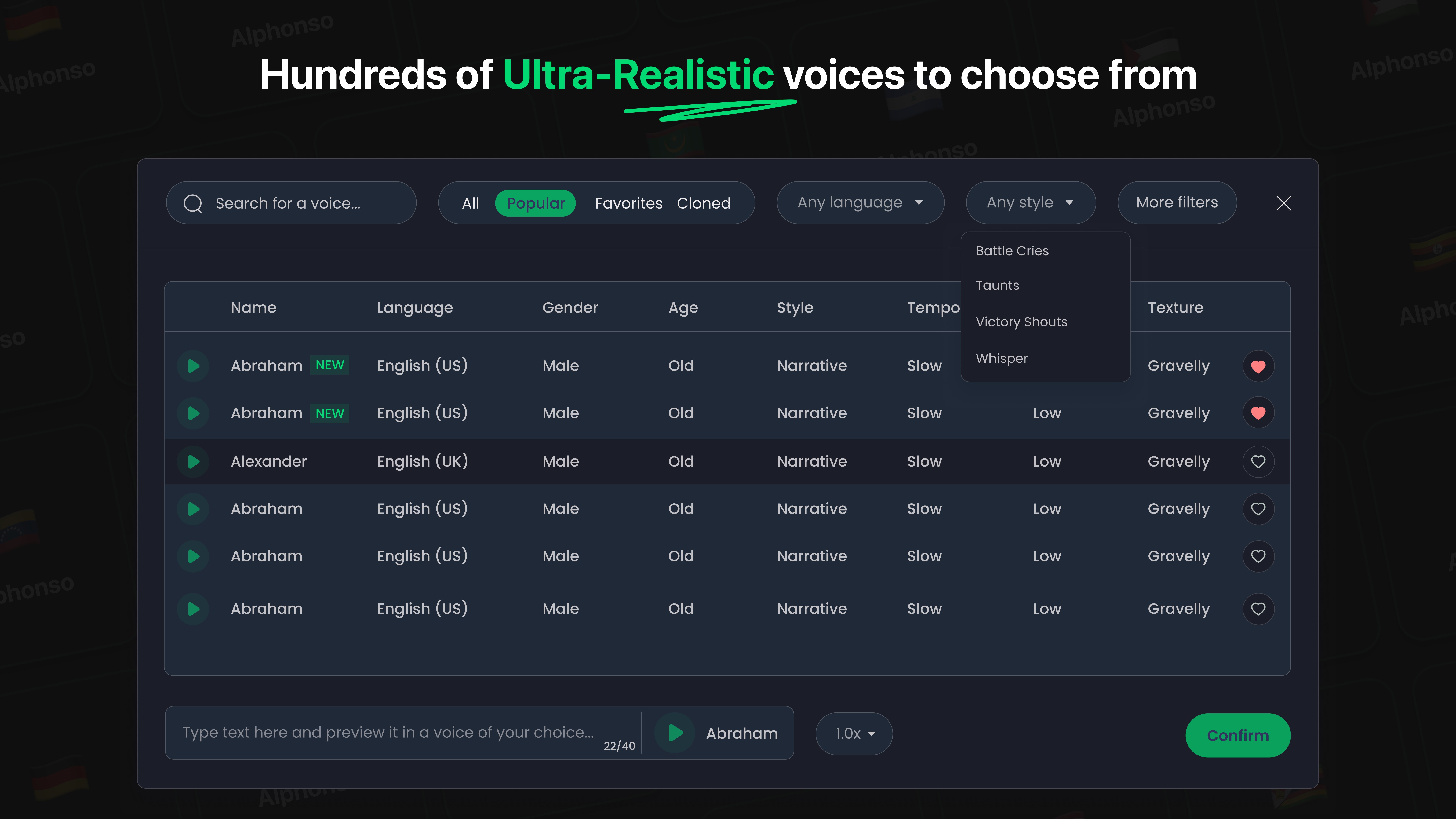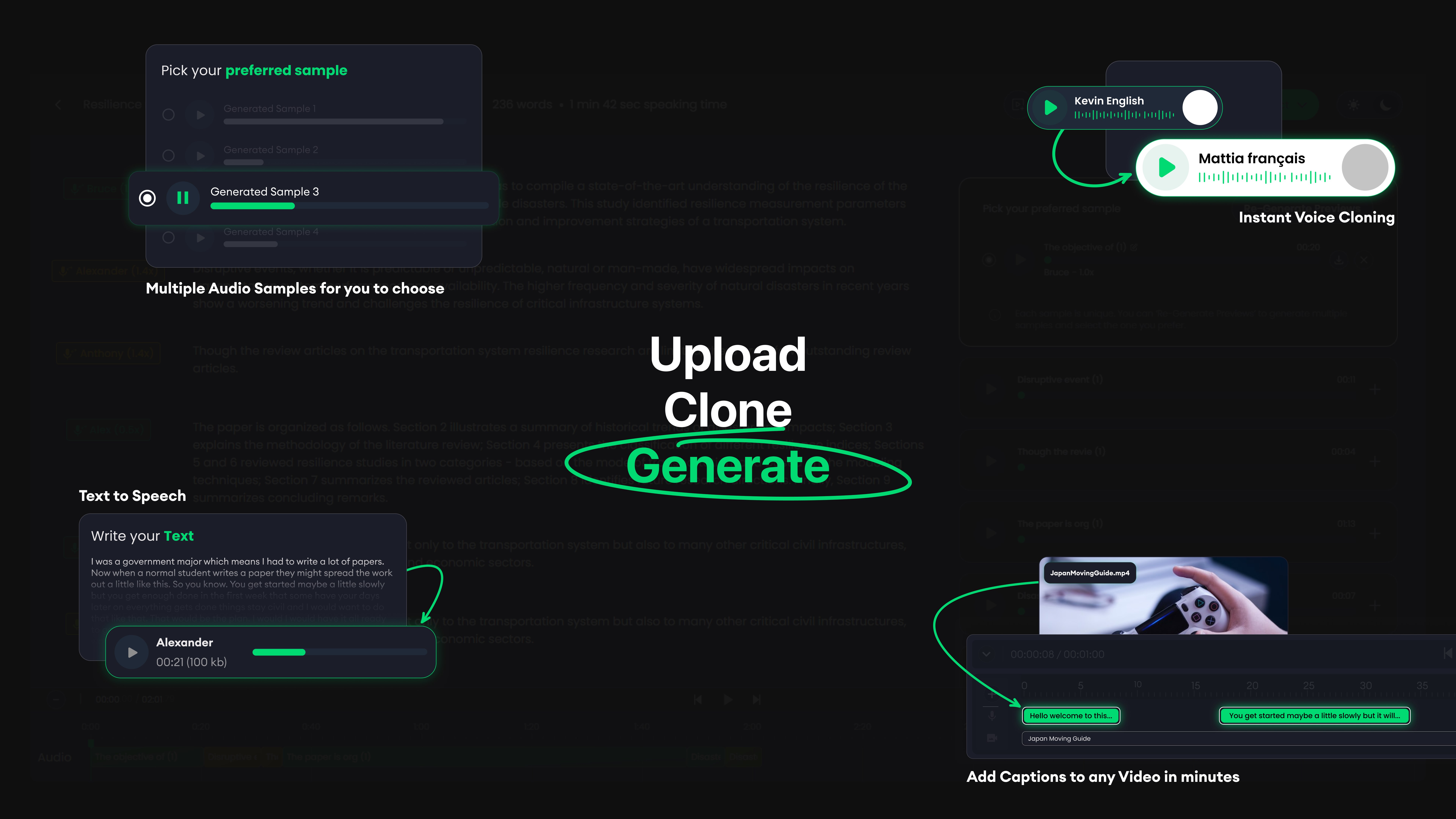 Generate Human-like voiceovers from text.Clone voices from 20 seconds of speech.Upload videos to sync the created audio with video.