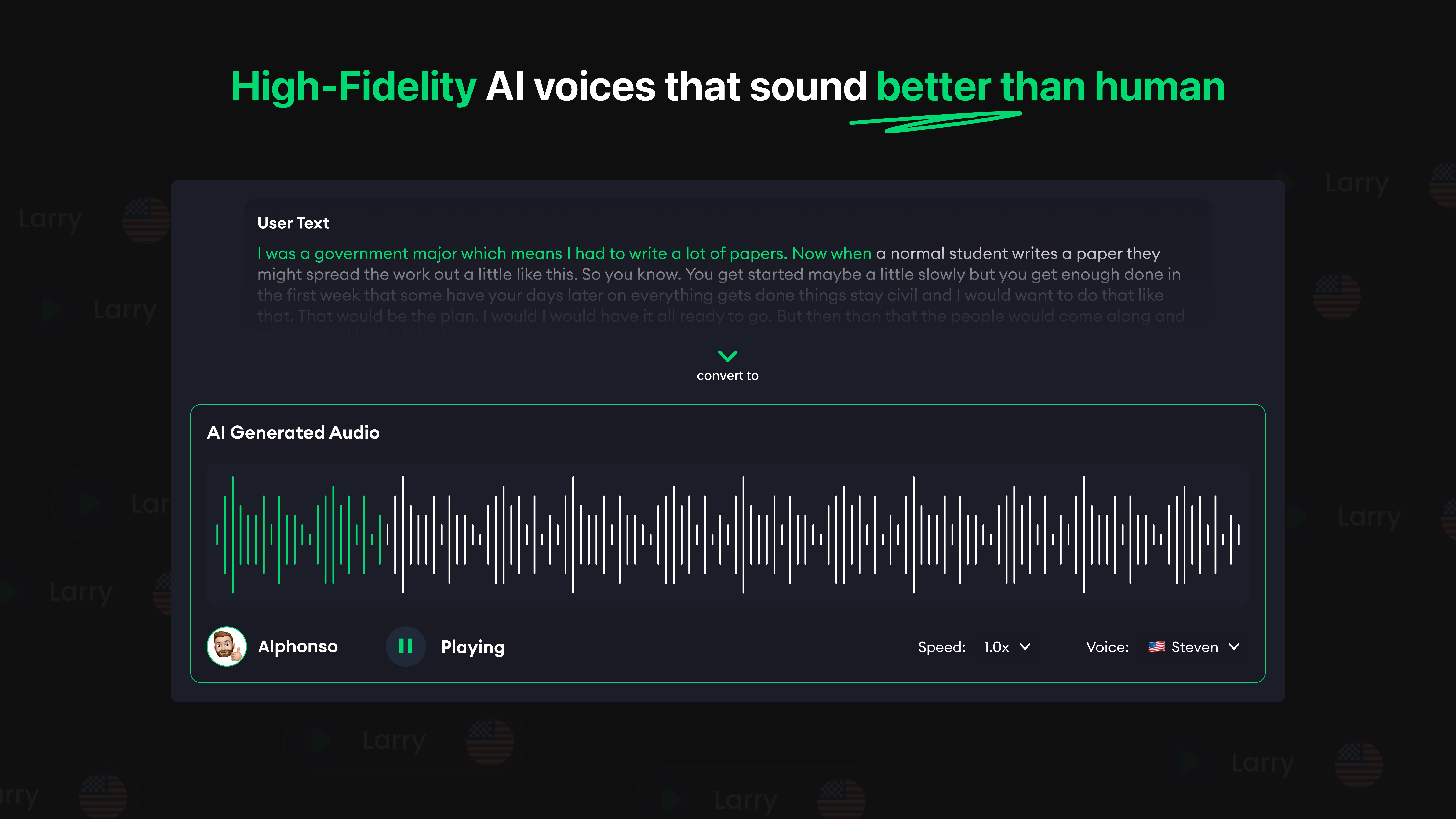 PlayHT allows anyone to generate truly human-like speech from text using a voice clone or an AI-generated voice. We help media companies scale and automate their content creation with our ultra-realistic and high-fidelity generative voices.