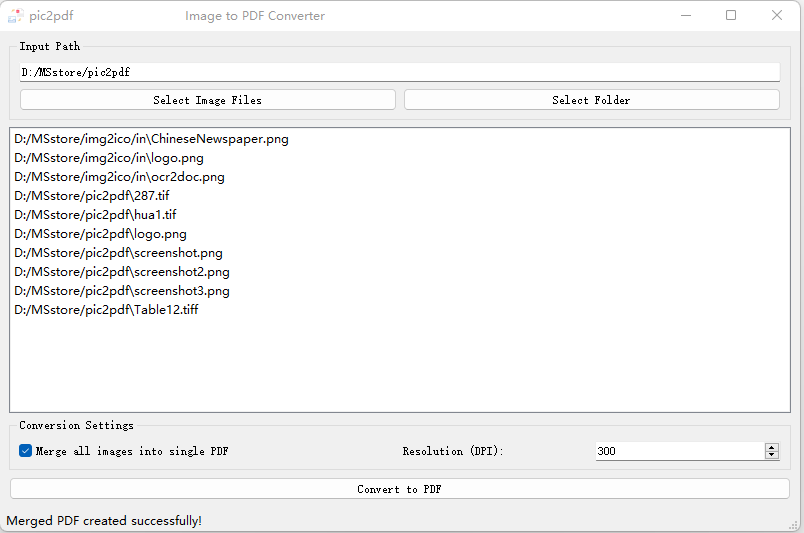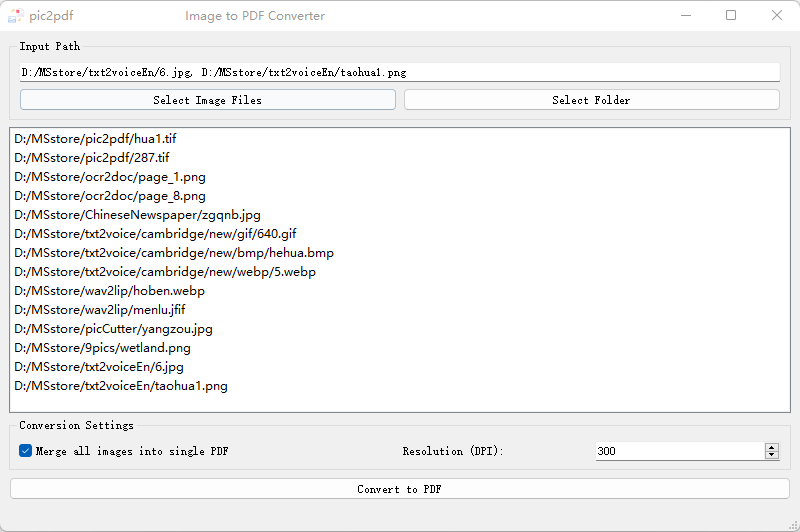 “pic2pdf”应用程序的主要功能是将多种图像文件转换为pdf文件,可选择将多个图像文件合并为一个pdf文件,可选择不同分辨率。