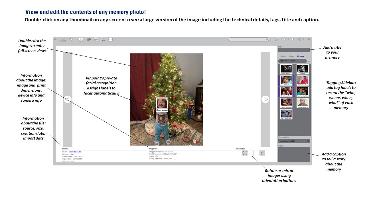 Unparalleled Organization: Pinpoint's robust features offer seamless management of both digital and analog memories. With our innovative system, you can effortlessly import and categorize your photos as well as eliminate duplicates. The intuitive tagging system allows you to mark each memory with the "who, where, when, and what," making it easy to find and relive those special moments.