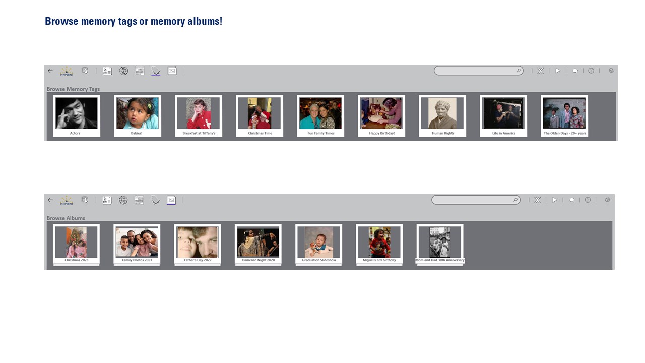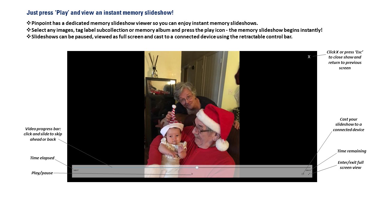 Elegant Display Options: Memories are meant to be displayed, not hidden away. Pinpoint boasts a sophisticated memory slideshow viewer, turning your collections into stunning visual narratives. Whether it's on your personal device or a connected screen, relive your memories in a visually appealing format, perfect for both personal enjoyment and sharing with others.