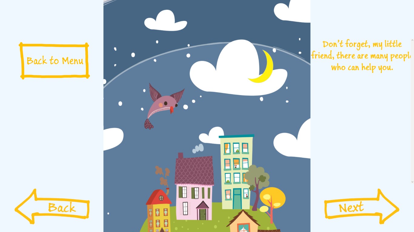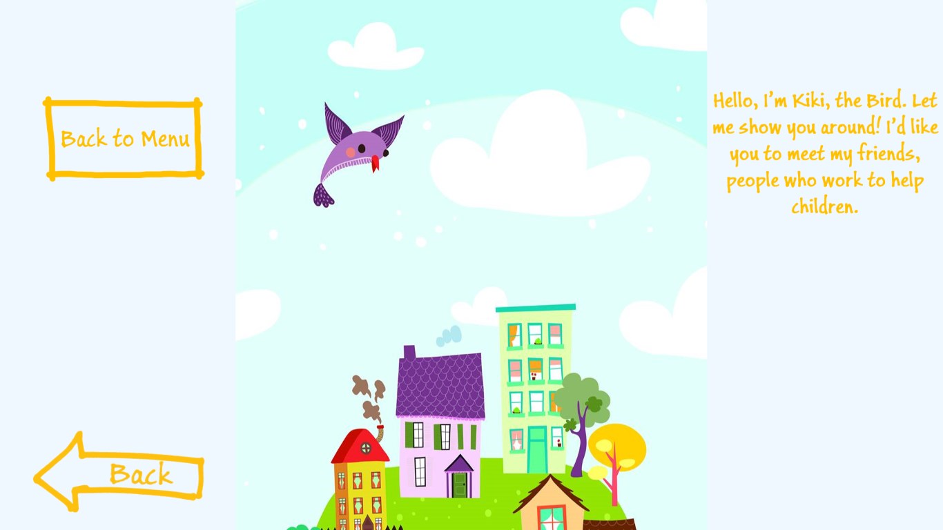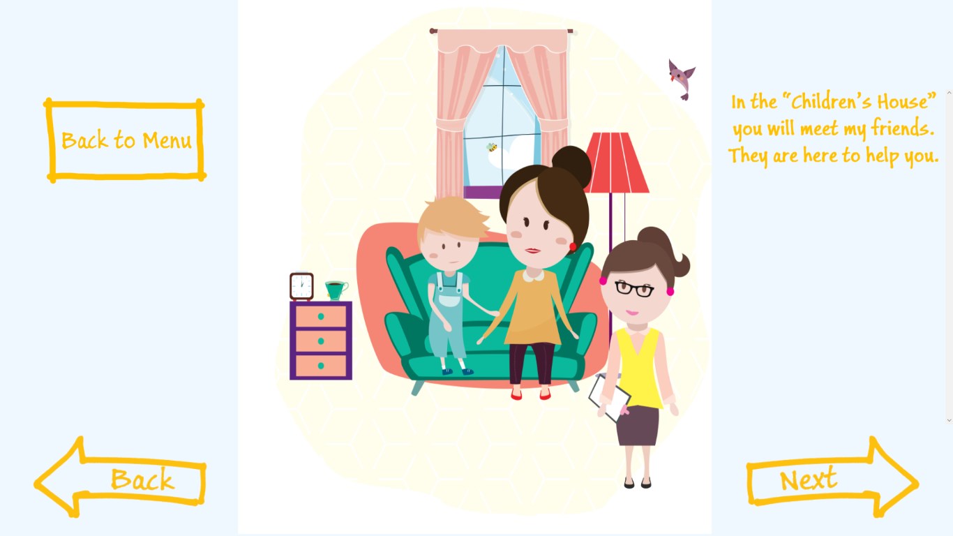 “Kiki and the Children’s House” is a Windows mobile/desktop application developed to support professionals working with young children in judicial procedures in cases of sexual violence. Through child-appropriate graphics and narration, Kiki explains to children the roles of different professionals and the stages of judicial procedures.