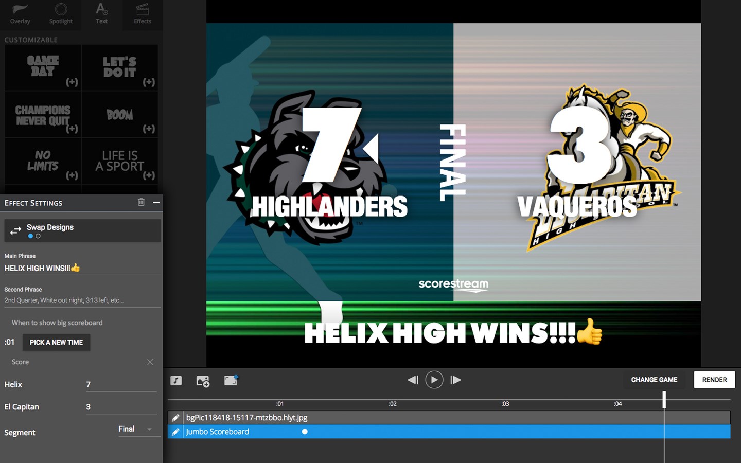 The SportFX Studio suite leverages the wealth of info in the ScoreStream ecosystem to take your personal pictures and videos and turn them into professional quality clips and graphics.