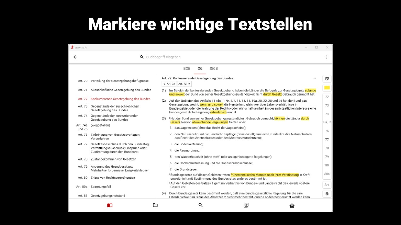 Die App enthält die wichtigsten Gesetze für Jurastudium, Rechtsreferendariat und die Rechtspraxis. Die Gesetze werden fortlaufend aktualisiert, sodass Du immer auf dem aktuellen Stand bist und nie mehr Nachsortieren musst.