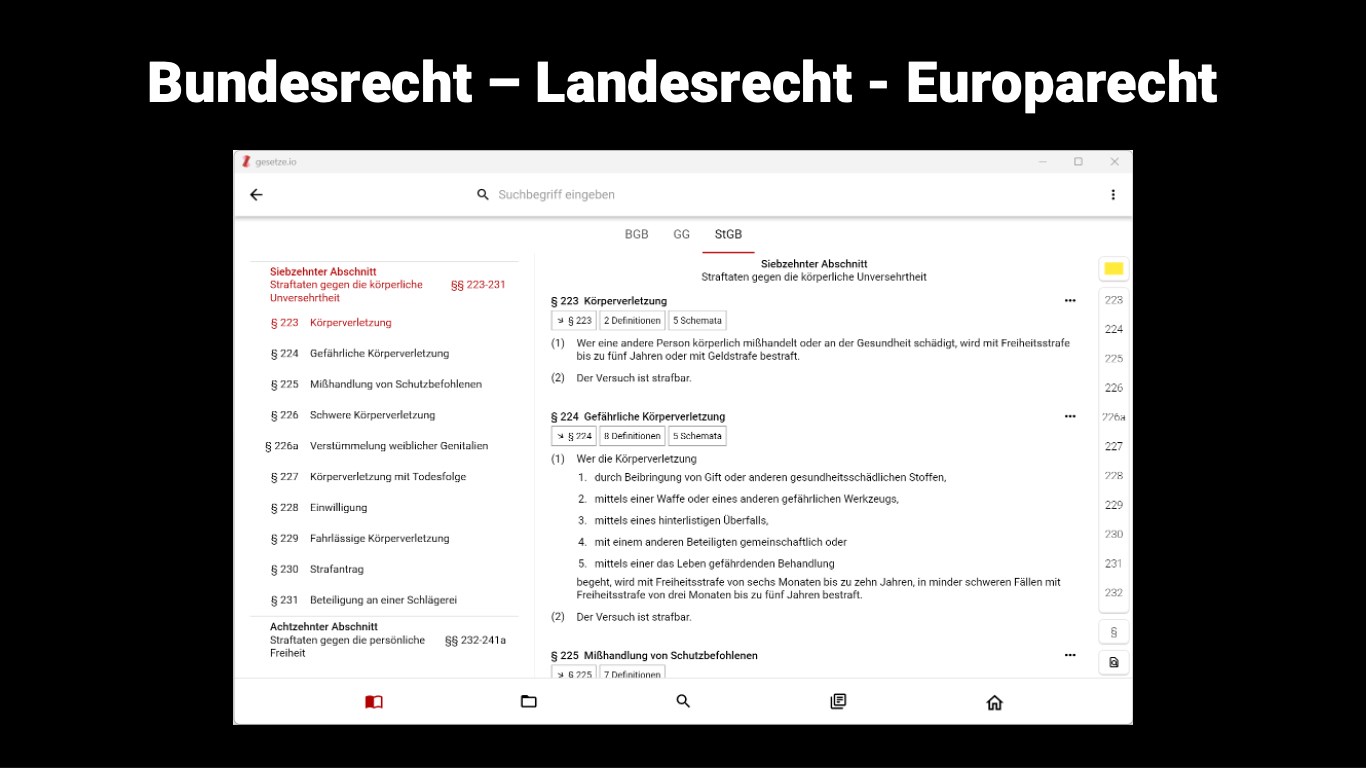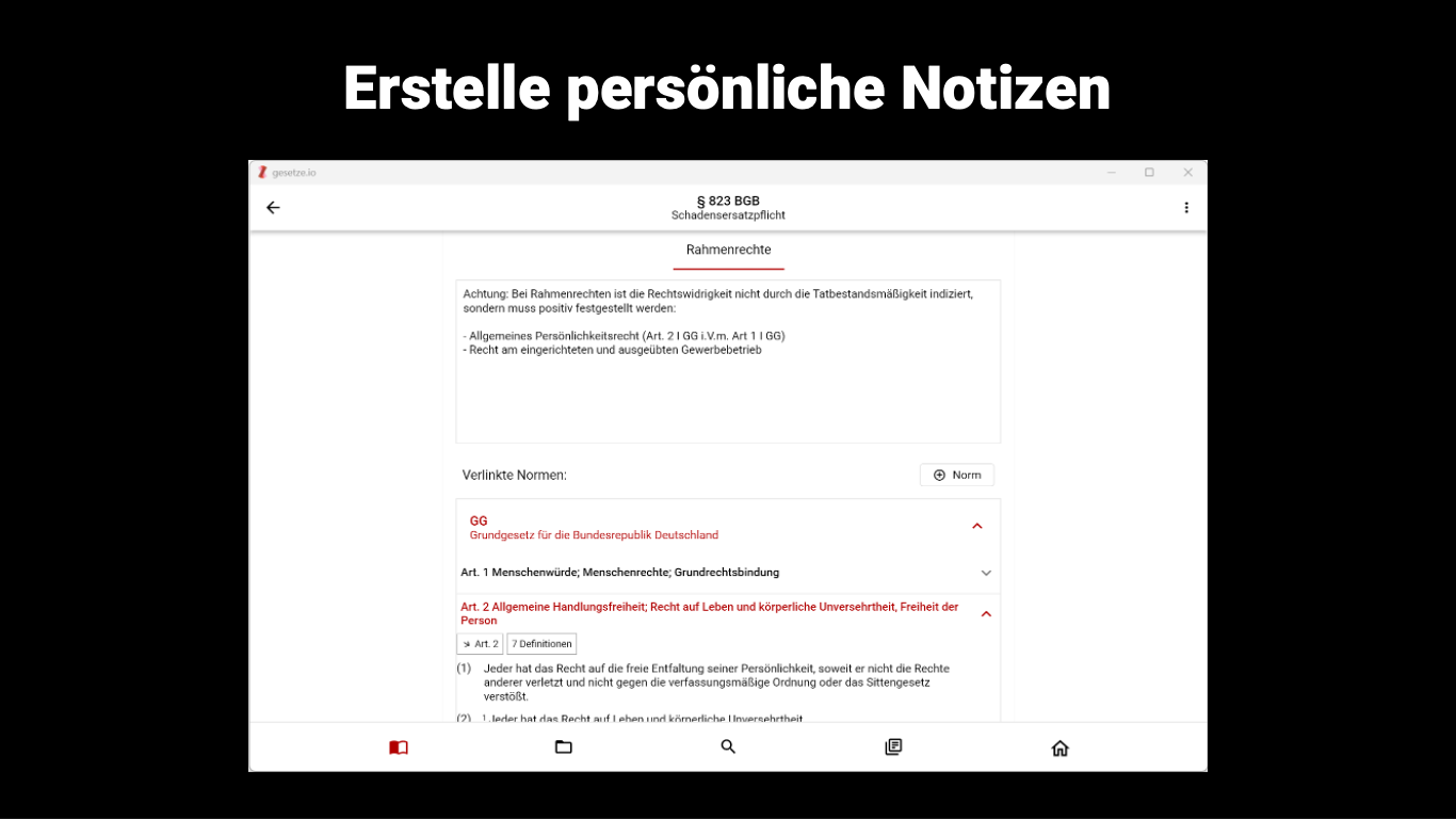 Die App enthält eine Vielzahl von juristischen Inhalten für Studium und Referendariat. Die Inhalte sind direkt an die jeweiligen Normen angedockt, sodass Du sie dort findest, wo Du sie brauchst. Weitere Inhalte werden laufend hinzugefügt.