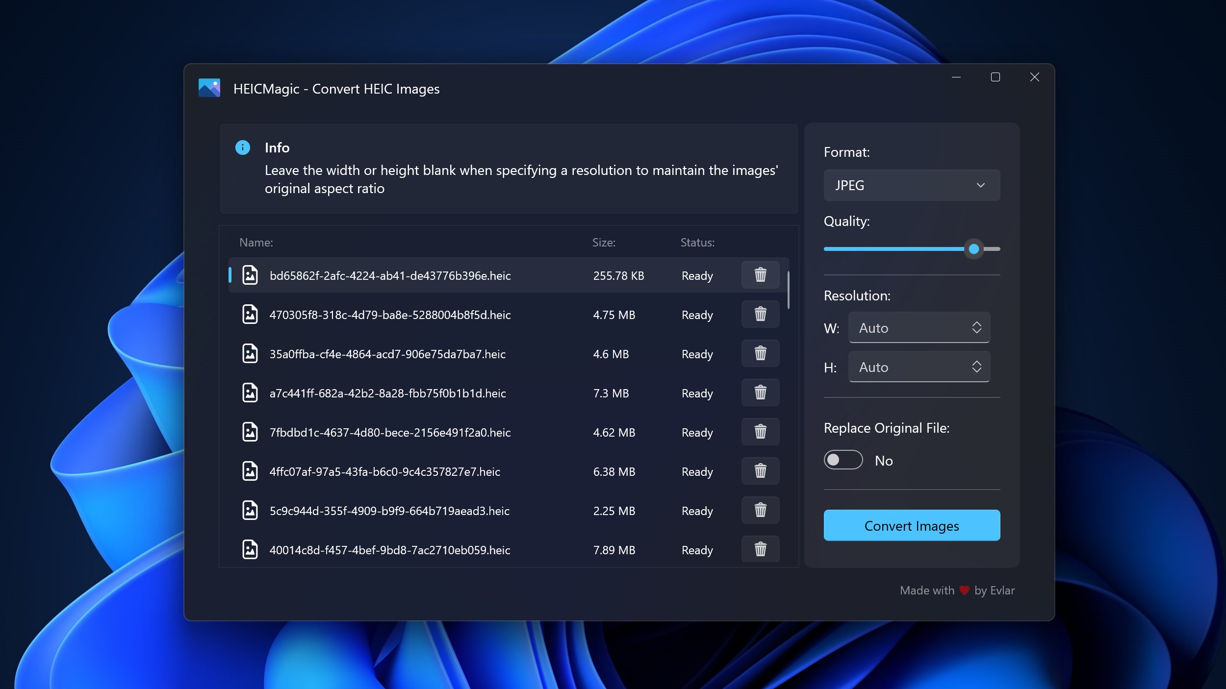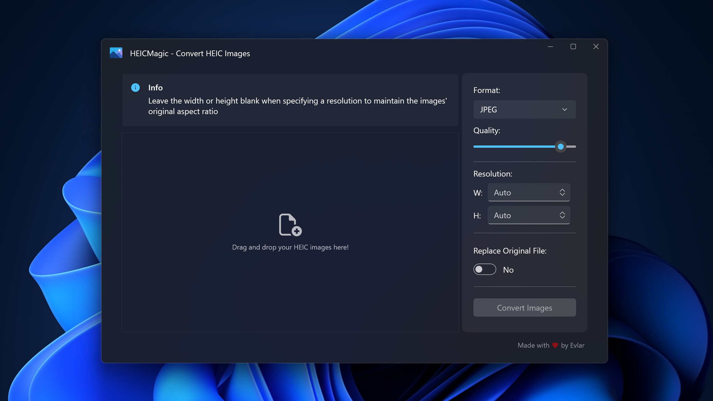 HEICMagic is a powerful Windows app designed to convert HEIC (High-Efficiency Image Format) images to widely supported formats like JPEG or PNG. With HEICMagic, you can effortlessly convert your HEIC images to ensure compatibility with various devices, software, and online platforms. Whether you're looking to share photos, upload images to websites, or work with HEIC files in applications that don't support the format, HEICMagic provides a user-friendly interface and efficient conversion capabilities. Simplify the process of converting HEIC images with HEICMagic - the ultimate HEIC image converter.