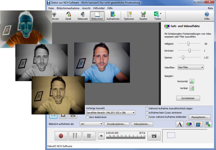 Bildschirm- und Videoaufnahmen waren noch nie so einfach wie mit Debut. Debut ist ein leistungsstarker Bildschirmrekorder, der Videos von fast jeder Quelle aus aufzeichnen kann - von Ihrem Computerbildschirm, Ihrer Webcam oder sogar von VHS-Bändern. Erstellen Sie mit Debut ganz einfach professionelle Video- und Tonaufnahmen mit den gängigsten Videoformaten wie AVI, WMV, FLV, MPG, MP4 und mehr. Mit der Bildschirmaufnahme können Sie Ihren gesamten Desktop, ein einzelnes Fenster oder einen ausgewählten Bereich auswählen. Passen Sie dann die Videoauflösung, die Größe und die Bildrate an. Mit Debut können Sie Ihren Aufnahmen Textunterschriften, Zeitstempel und Video-Overlays hinzufügen. Die Maus-Hervorhebungsfunktion markiert den Cursor, damit Zuschauer leichter folgen können. Nehmen Sie Audio von Ihrem Mikrofon und Ihren Lautsprechern auf, ideal für Videokonferenzen. Wenn Sie mit der Aufnahme fertig sind, speichern Sie Ihr Video direkt auf Ihrer Festplatte, geben Sie es online frei oder lassen Sie es automatisch per E-Mail senden.