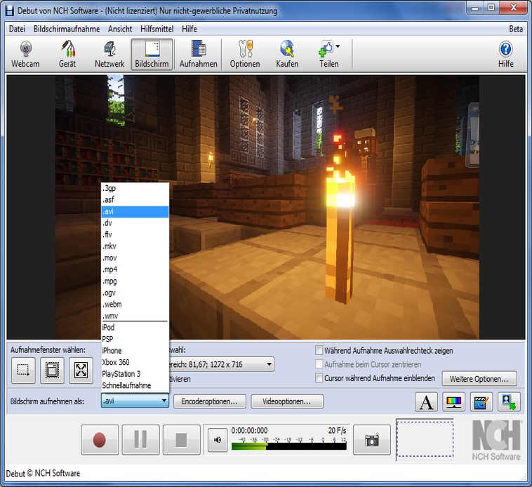 Intuitive Benutzeroberfläche, mit der Sie direkt mit der Aufnahme beginnen könnenPassen Sie Ihre Bildschirmaufnahme an, indem Sie den gesamten Bildschirm, ein Fenster oder einen bestimmten Bereich aufzeichnenVideo aus mehreren Quellen ziehenVideo-Overlay zeichnet Ihren Bildschirm und Ihre Webcam gleichzeitig aufPassen Sie Ihre Farbeinstellungen und Videoeffekte vor der Aufnahme anDie Zoom-to-Mouse-Funktion fokussiert die Aufnahme auf den CursorZeitraffervideos aufnehmenMachen Sie jederzeit Schnappschüsse von Ihrem VideoSpeichern Sie Ihre Videos in einer Vielzahl von FormatenOnline freigeben oder auf Festplatte oder externen Datenträgern speichern