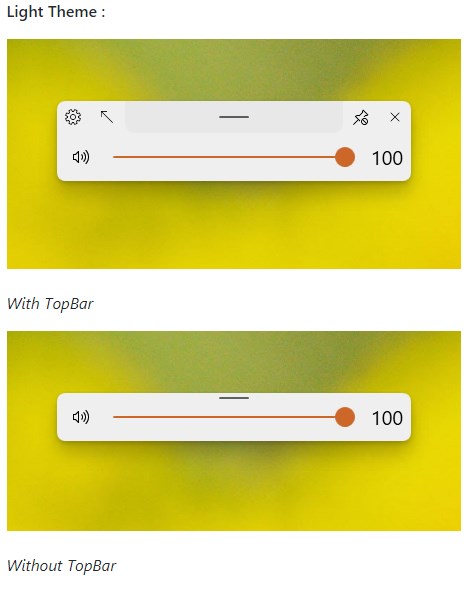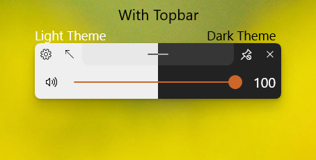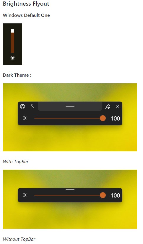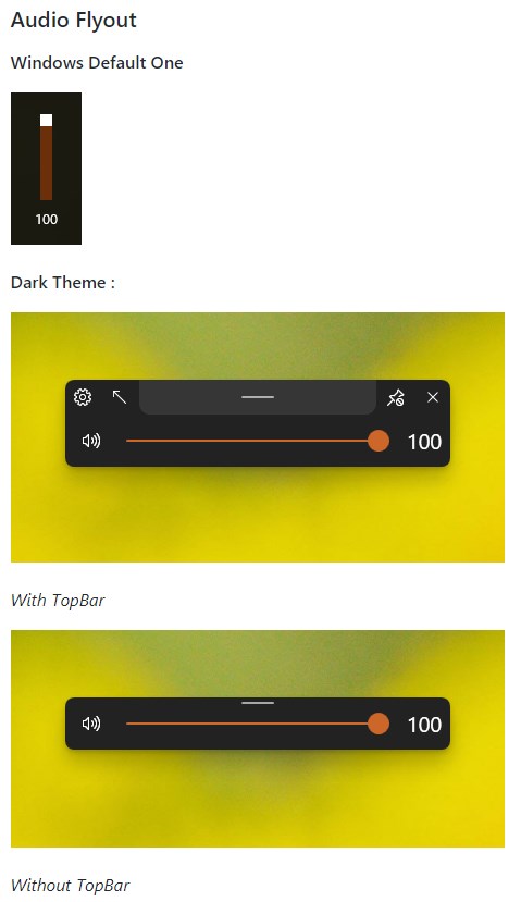 This application will replace the default audio/airplane/brightness flyouts found in Windows shown when the volume or brightness changes or when airplane mode key is pressed with a customisable Flyout with a modern UI.