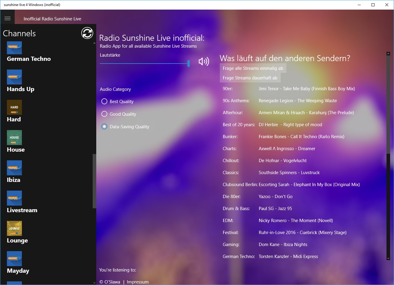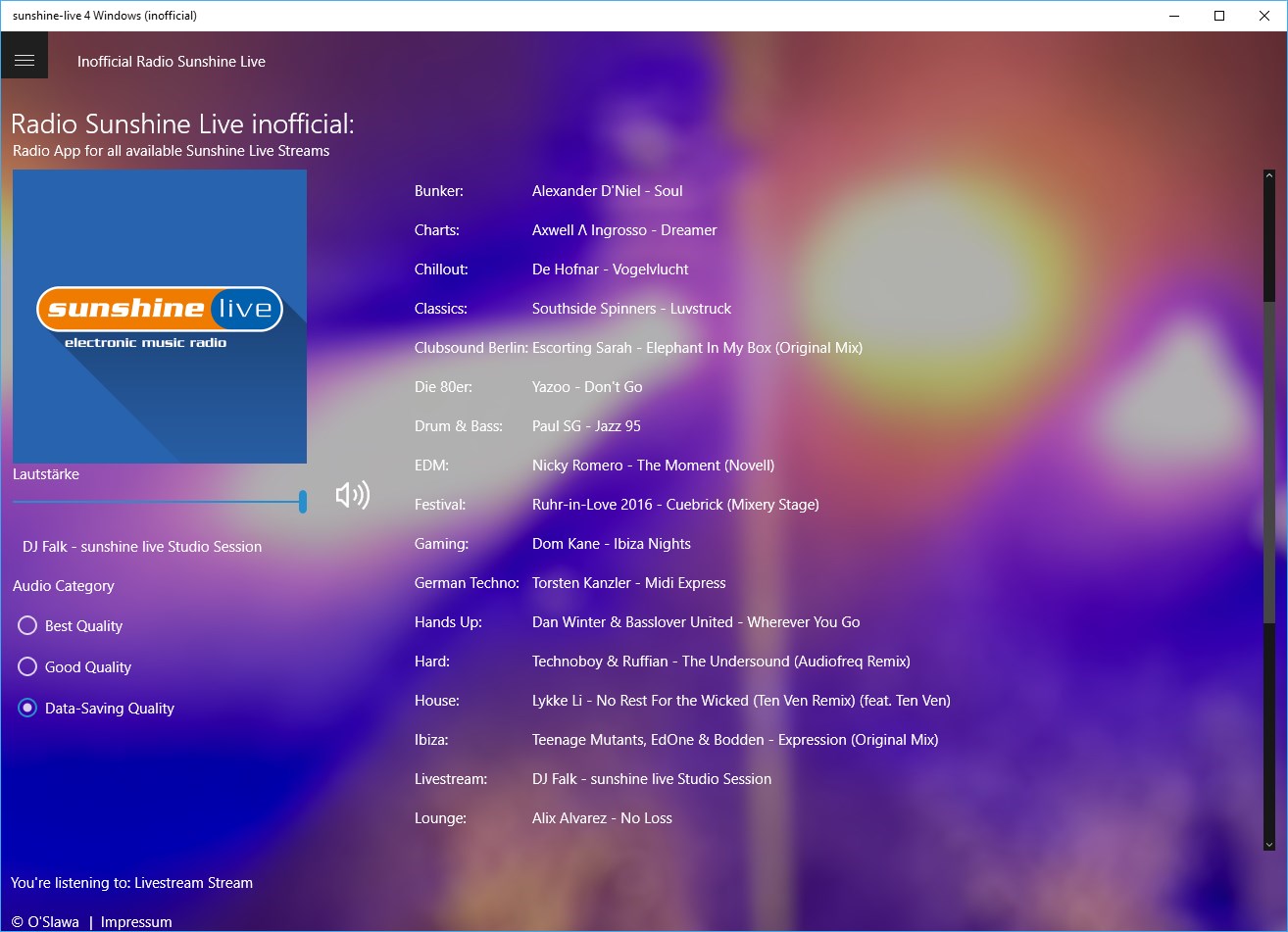 Currently 33 streams are offered, which specify different electronic music styles or sets of past events like TimeWarp, Mayday or Nature One.