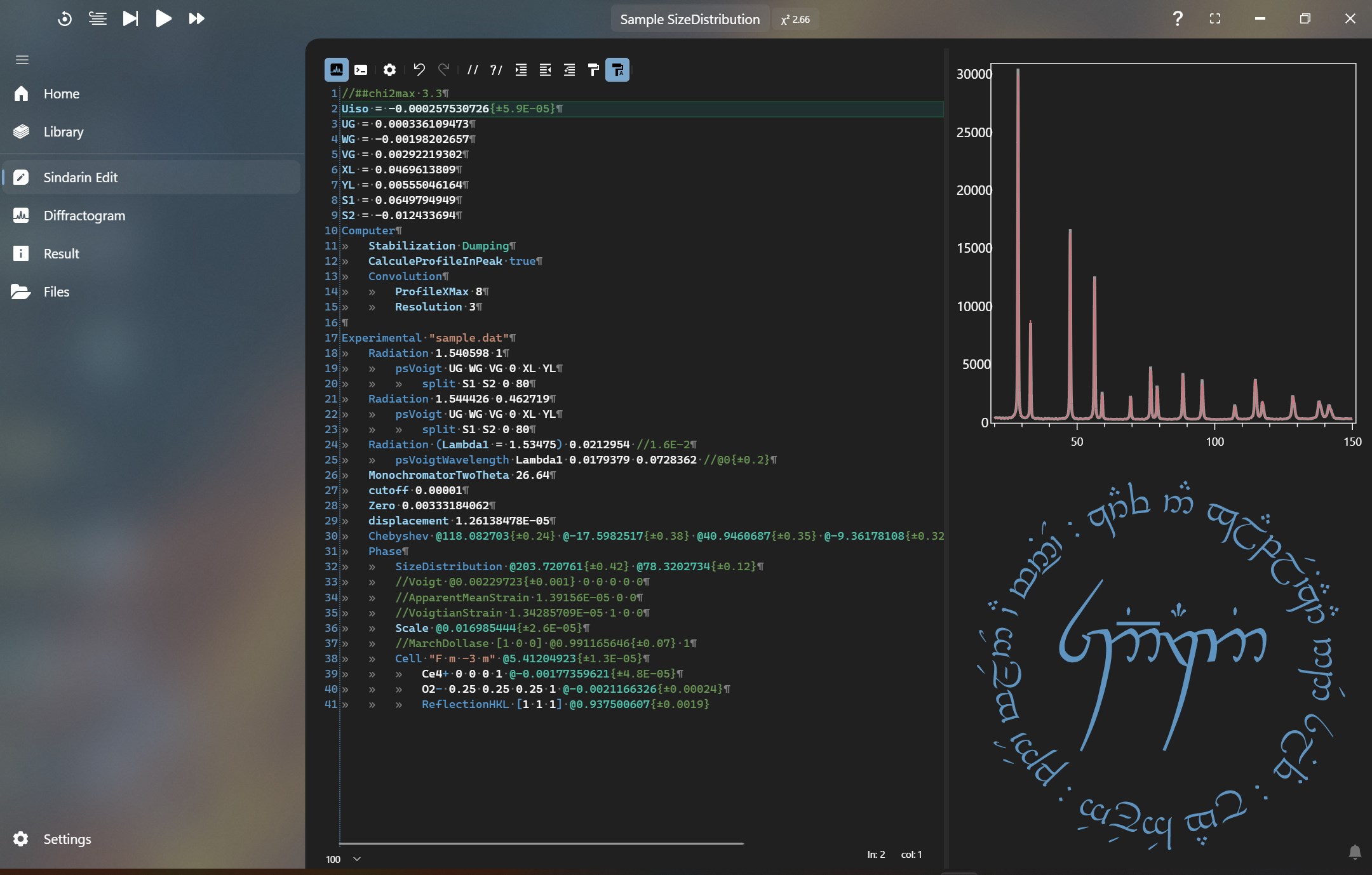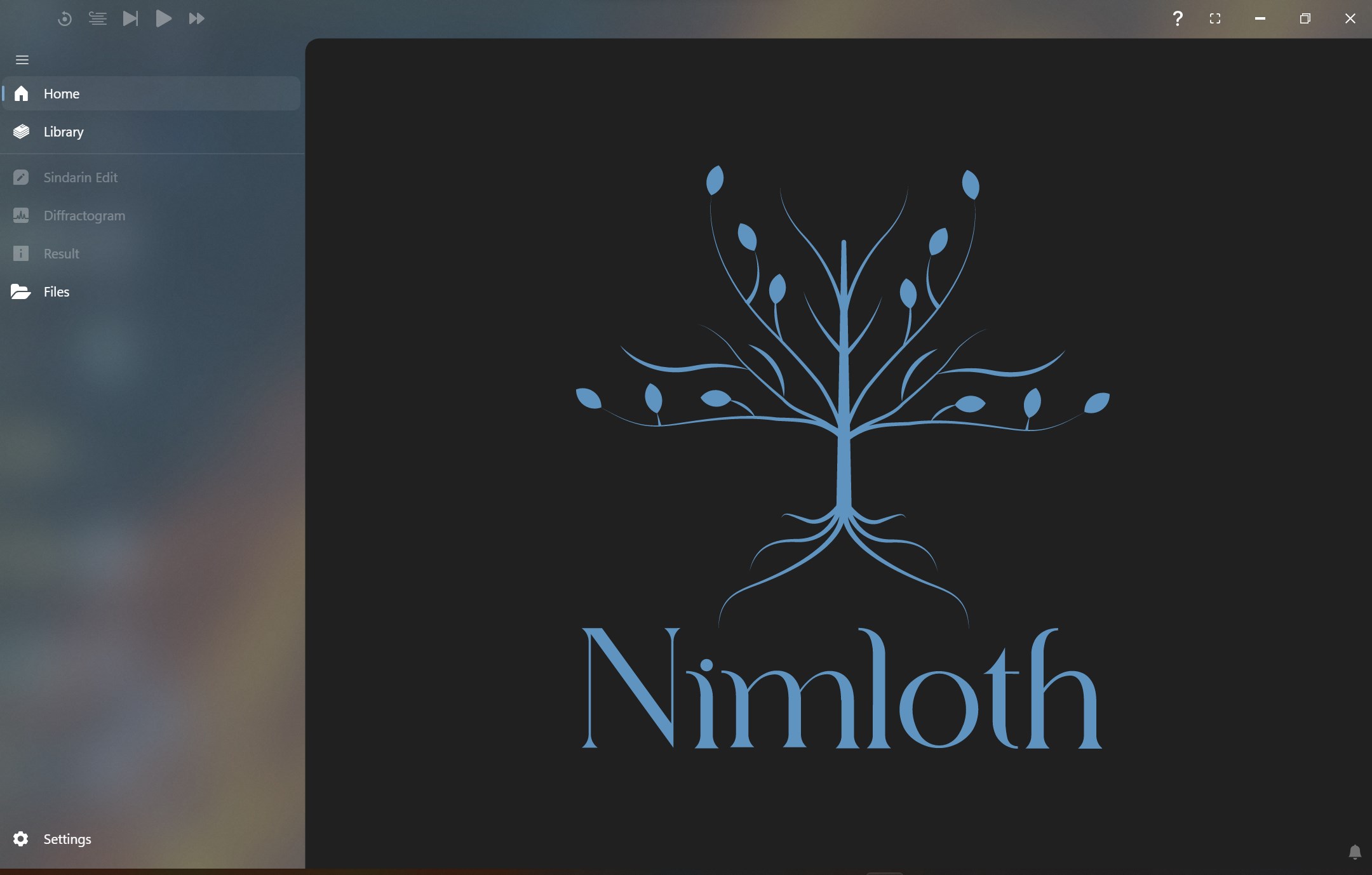 Nimloth is a program that provides an integrated environment for the use of Sindarin and helps the user in the daily work of editing code, performing calculations, viewing results, among other tools. It is build with modern concepts about app with simple, clean, easy and beautiful interface. Sindarin is a program to performer several calculations for polycrystalline diffraction techniques, including, but not limited to, Rietveld refinement, Fundamental Parameters Approach (FPA) and Whole Powder Pattern Modelling (WPPM). It is designed to be flexible and simple, using a plain text file written in a proprietary syntax for calculations