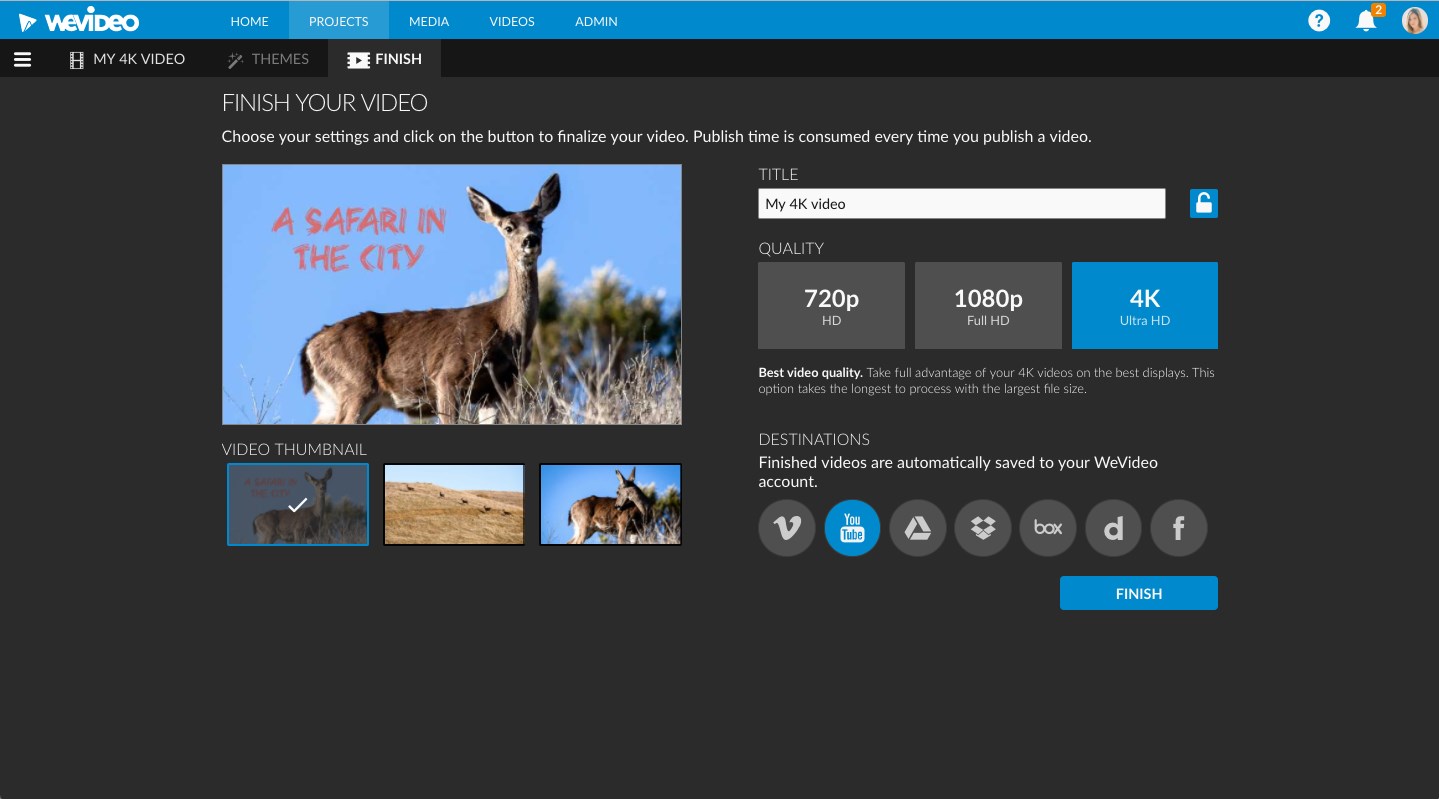 Easy-to-use themes kickstart any project. A music library, tons of special effects, and eye-catching graphics let you quickly enhance your project. Anything students and teachers can imagine, WeVideo can make possible. Quickly combine your favorite video clips, photos, music and audio, freely mixing and matching more than 600 audio, video, and graphics media formats and video resolutions up to stunning 4K. Once completed, your unique movies can be streamed from the web, shared online, or saved offline to watch on TVs, projectors and devices.