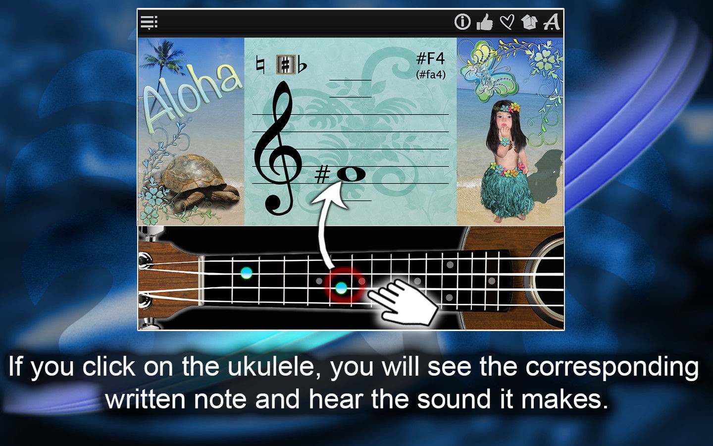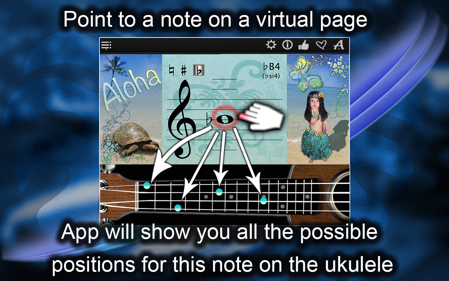When you point to a note on a virtual page, UkuleleNotesFinder will show you where this note is on a ukulele and the other way around, if you click ukulele fretboard, you will see the corresponding note and hear the sound it makes.