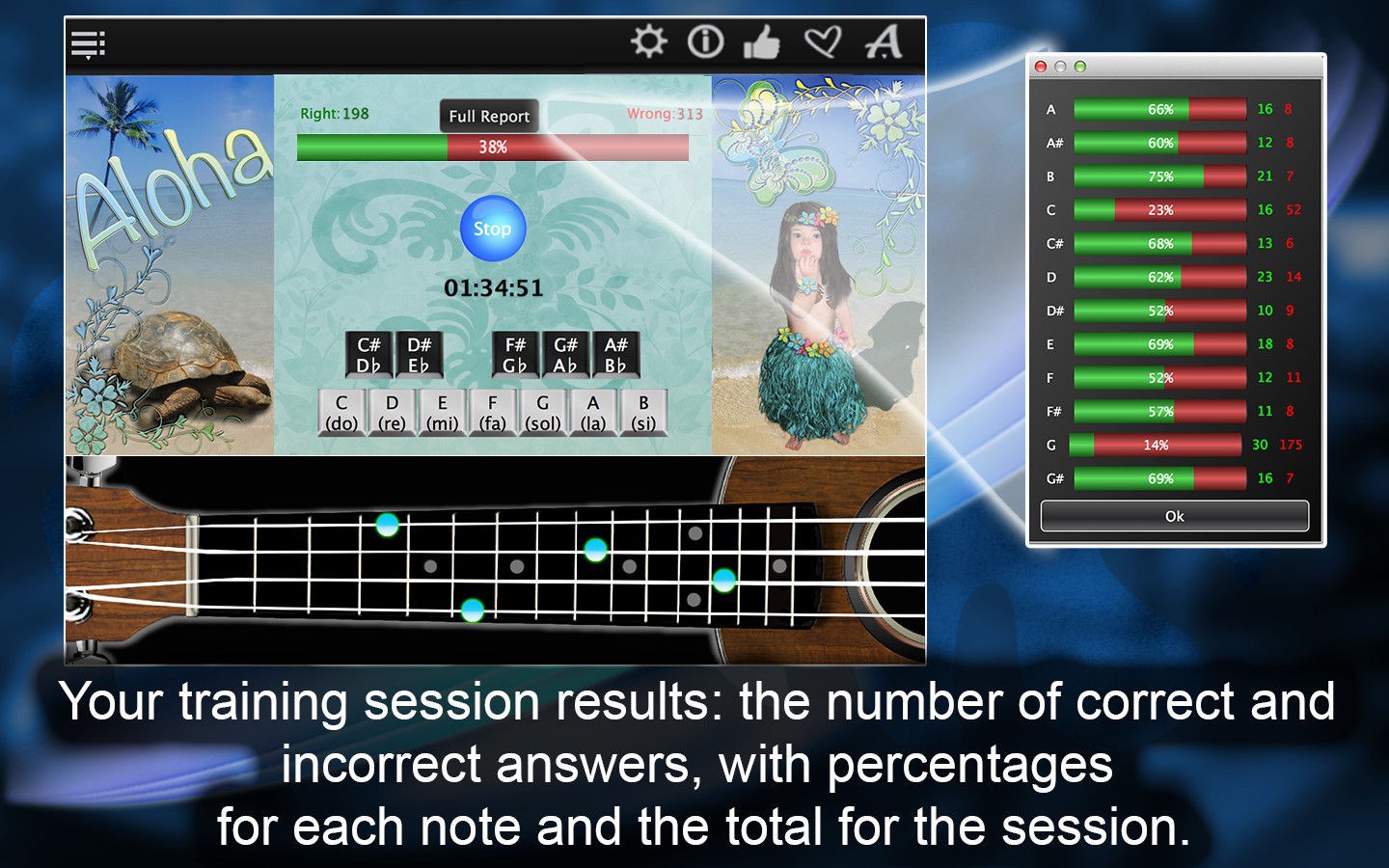 The “Notes Trainer” asks for the notes, showing you the frets, and offers the full statistics to show where you are making mistakes, so you can measure progress in sight reading and see when you’ve exceeded your personal best.