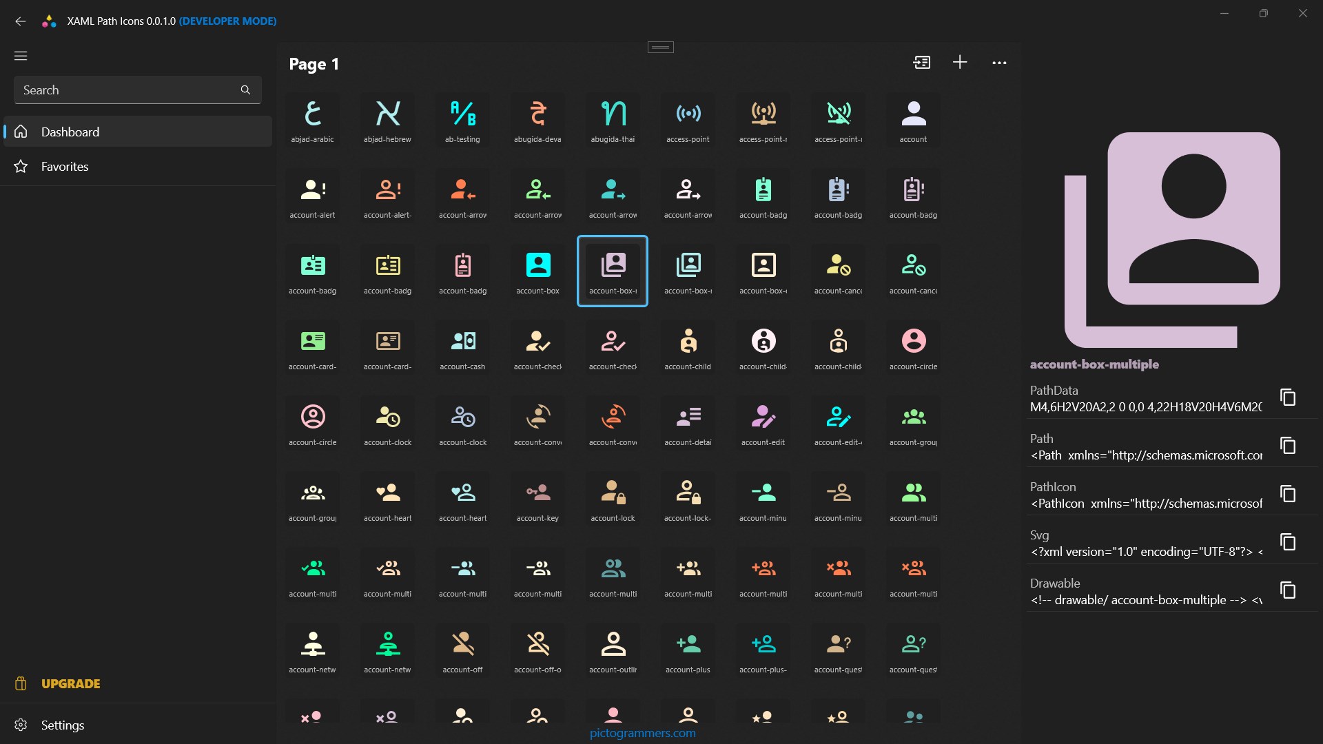 U+1F4A1 Copy path data.U+1F4A1 Copy xaml, svg, xml to clipboard.U+1F4A1 Import/Export custom path data collection (json file).U+1F4A1 Add new icon (Path, Name, Author).U+1F4A1 Edit, delete and update, icon.U+1F4A1 Set icon size, enable random icon colors.U+1F4A1 Fast auto complete search box for fast icon query.