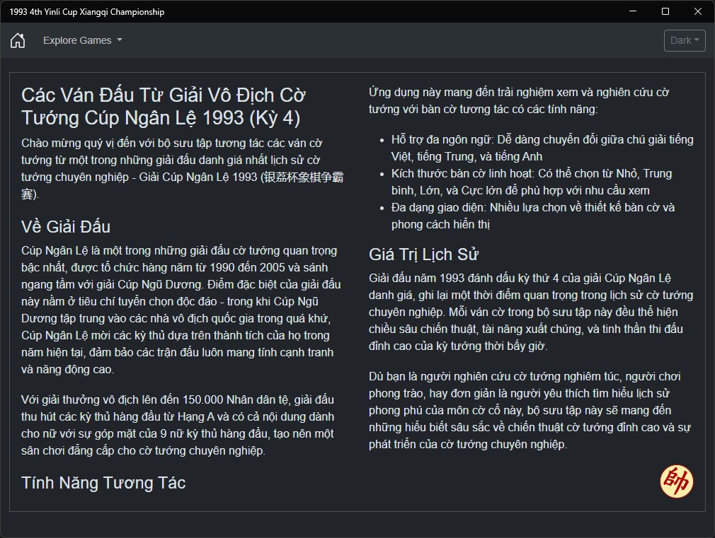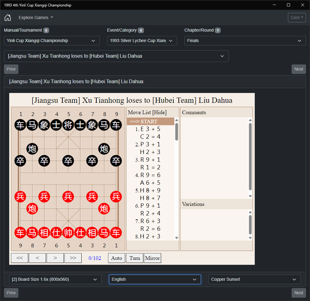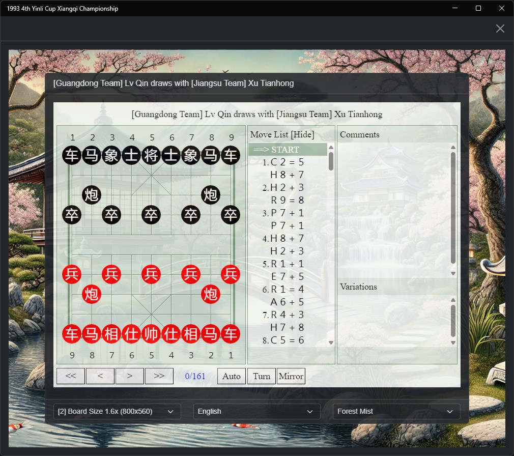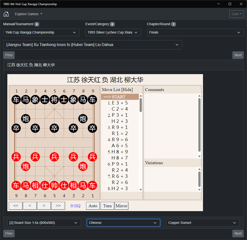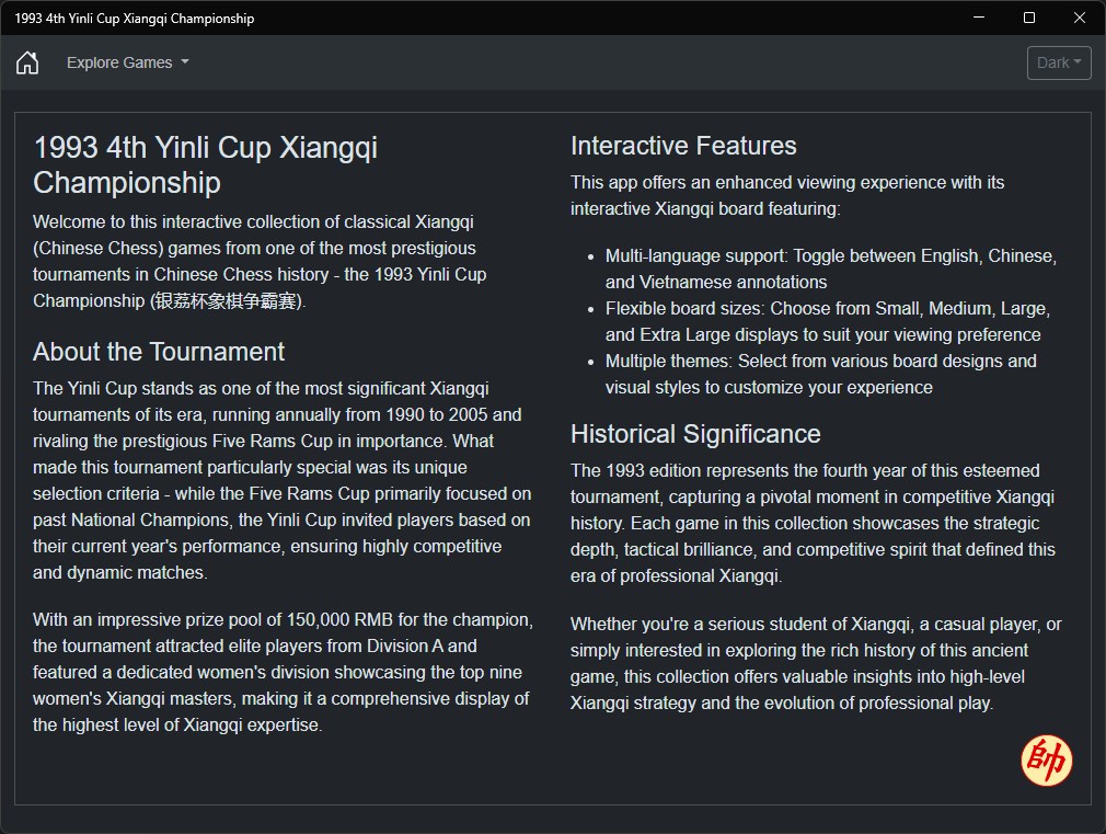 Welcome to this interactive collection of classical Xiangqi (Chinese Chess) games from one of the most prestigious tournaments in Chinese Chess history - the 1993 Yinli Cup Championship (银荔杯象棋争霸赛).