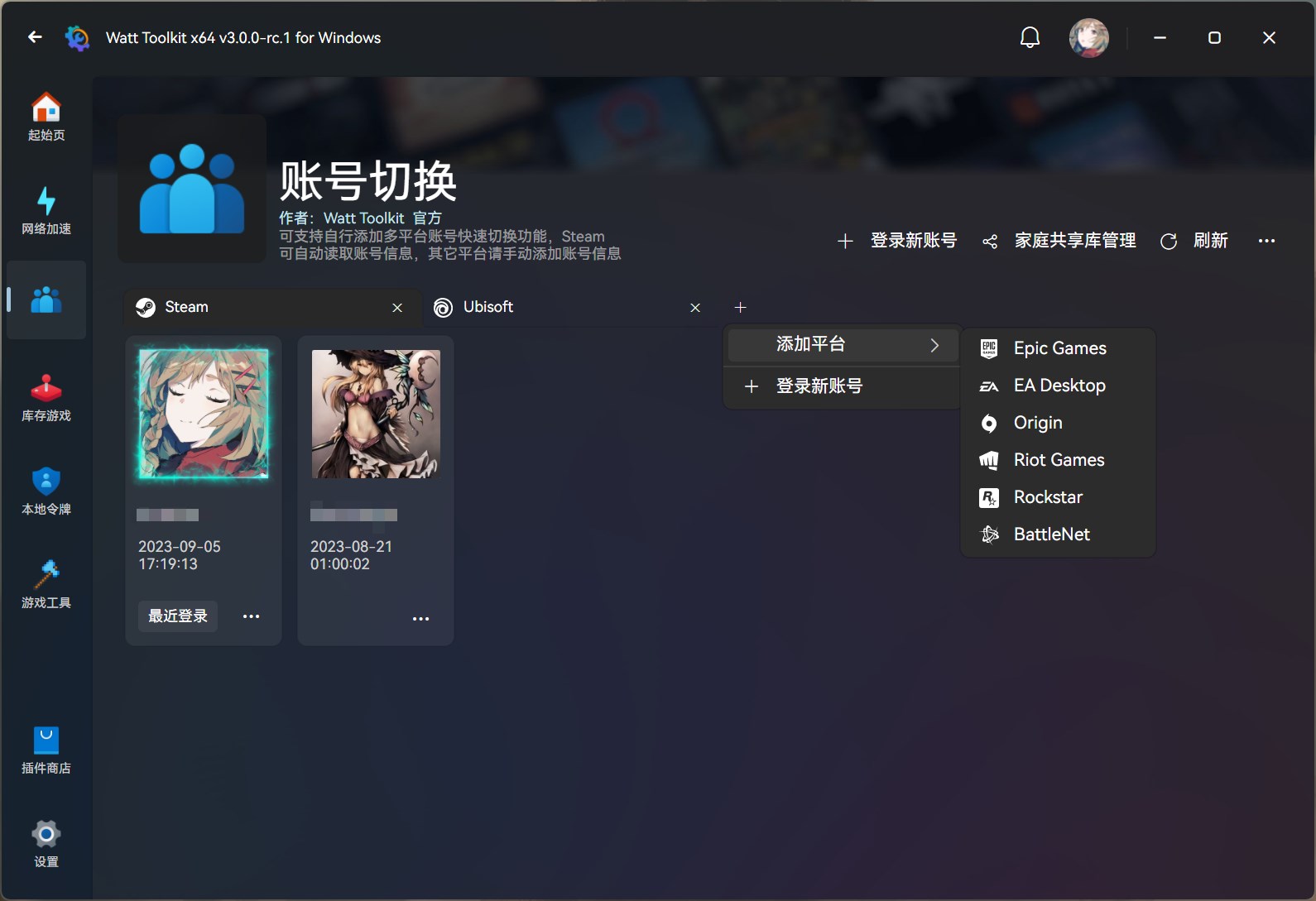 快速切换已在当前 PC 上登录过的 Steam、Epic、Uplay 等等多平台账号,与管理 Steam 家庭共享库排序及禁用等功能。