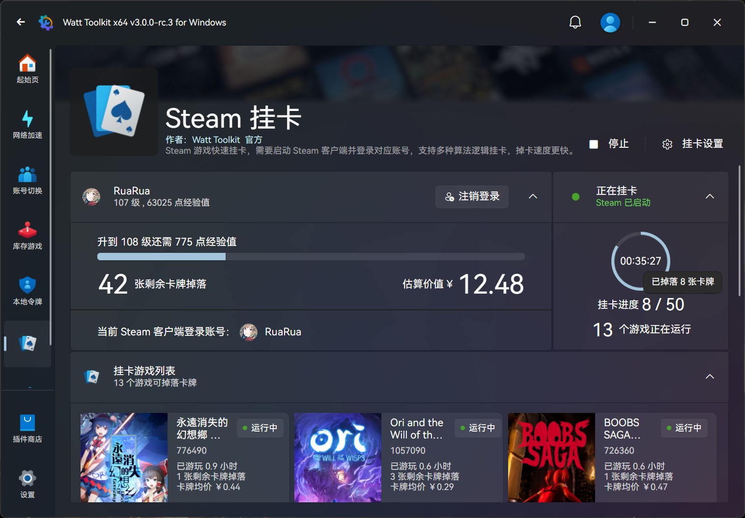 模拟运行 Steam 游戏,让您不用安装和下载对应的游戏也能挂游玩时间和掉落 Steam 卡片