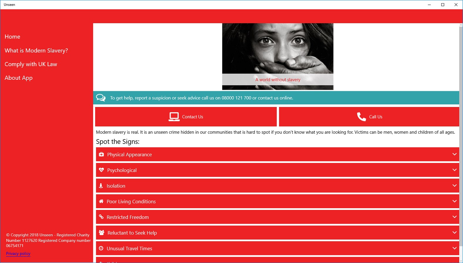 And it makes reporting concerns or suspicions to Unseen’s Modern Slavery Helpline easy – you can either fill in a report or call direct at the click of a button.