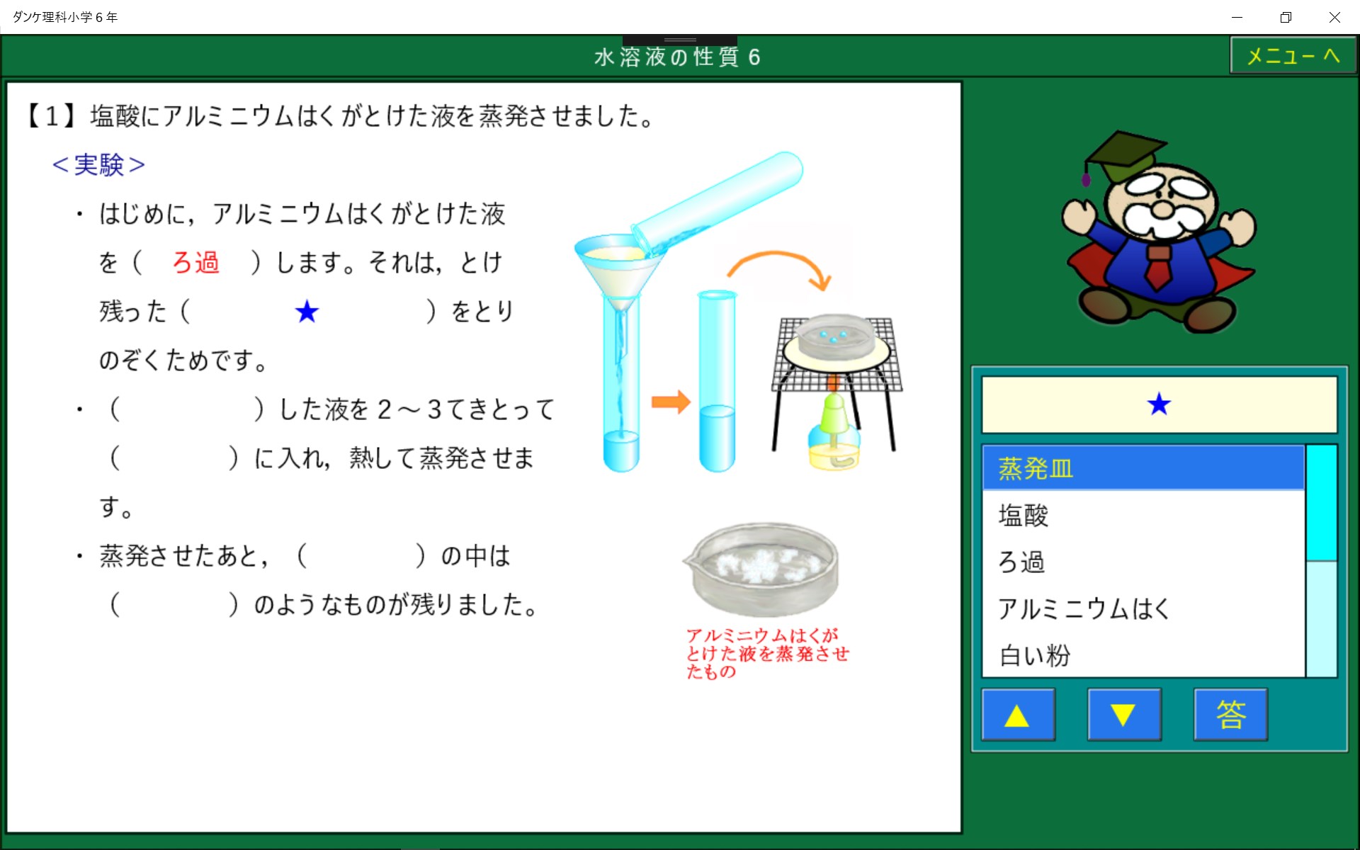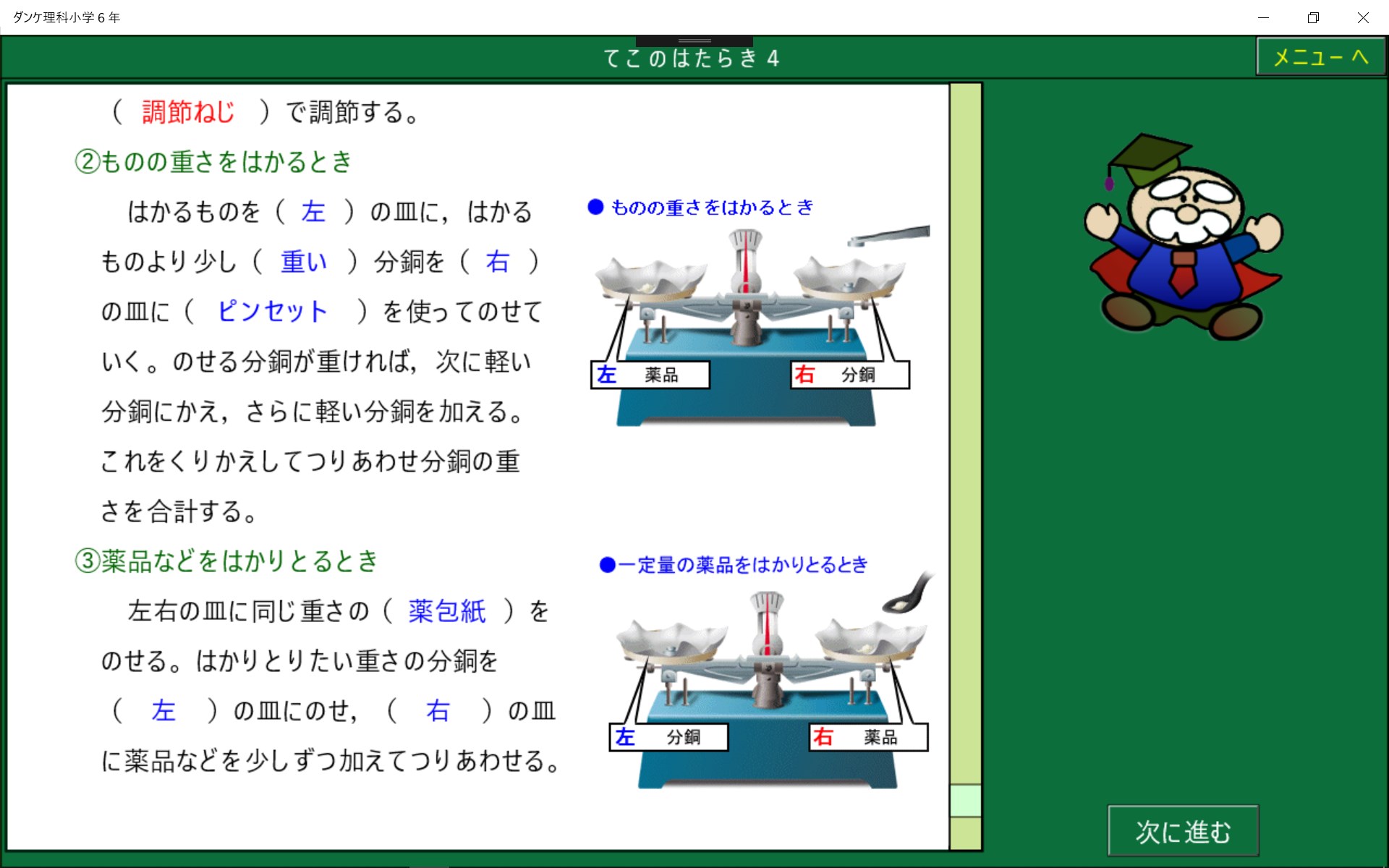 小学校6年生で学習する理科のソフトです。たくさんのイラストで楽しく学習できます。学習指導要領にもとづいています。