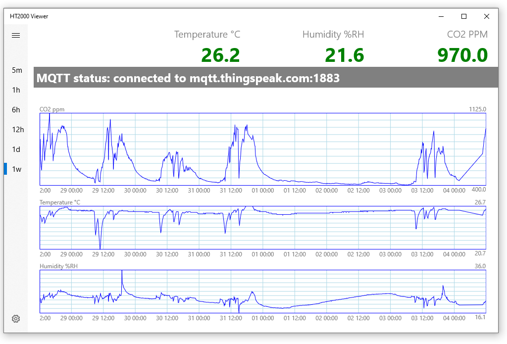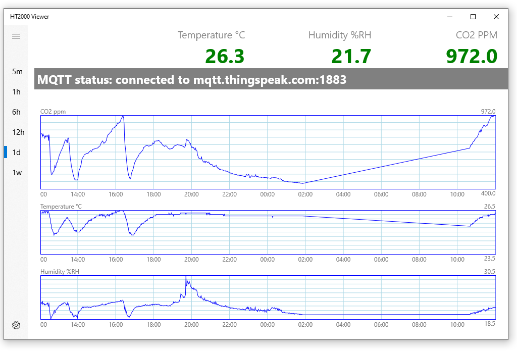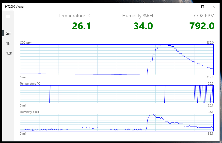 Utility for monitoring XINTEST HT-2000 CO2 meter. It how the co2, temperature and humidity. The data is presented in some time scales - 5 min, 1h, 6h, 12 hours and 1 week.