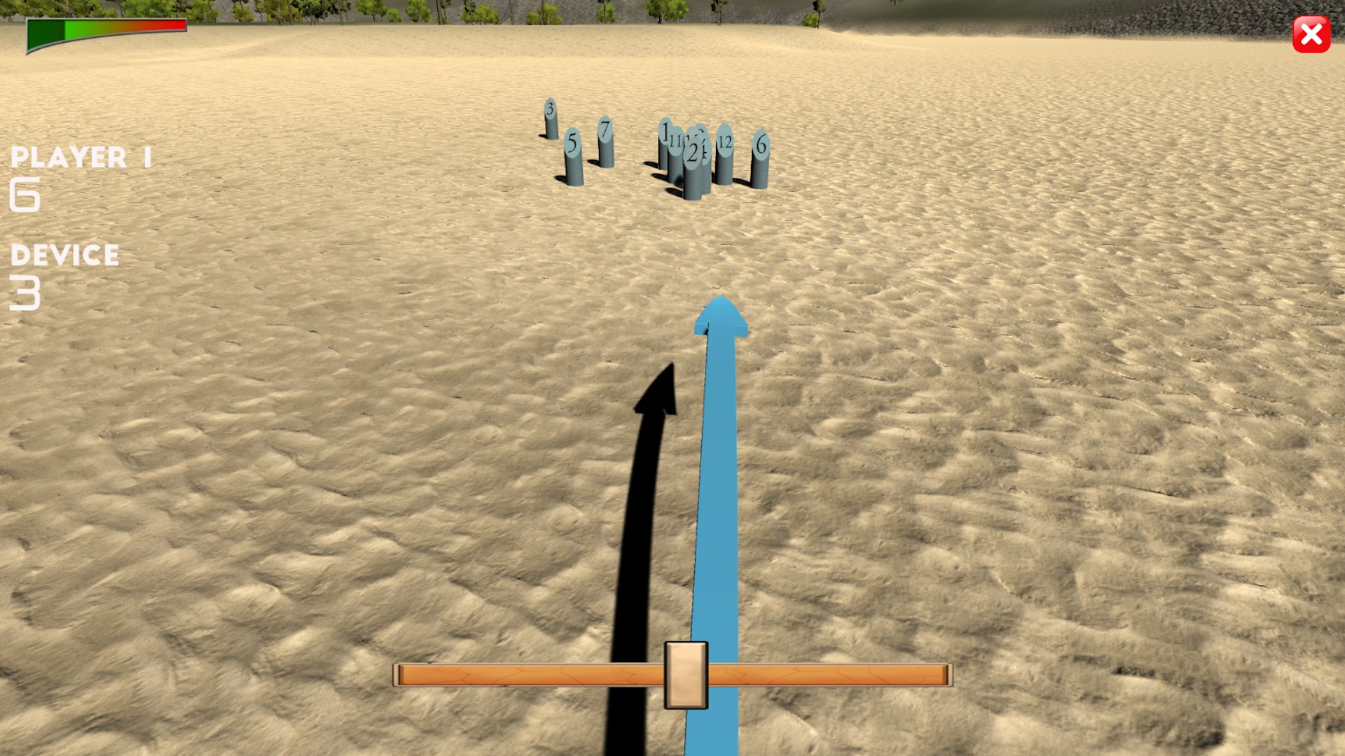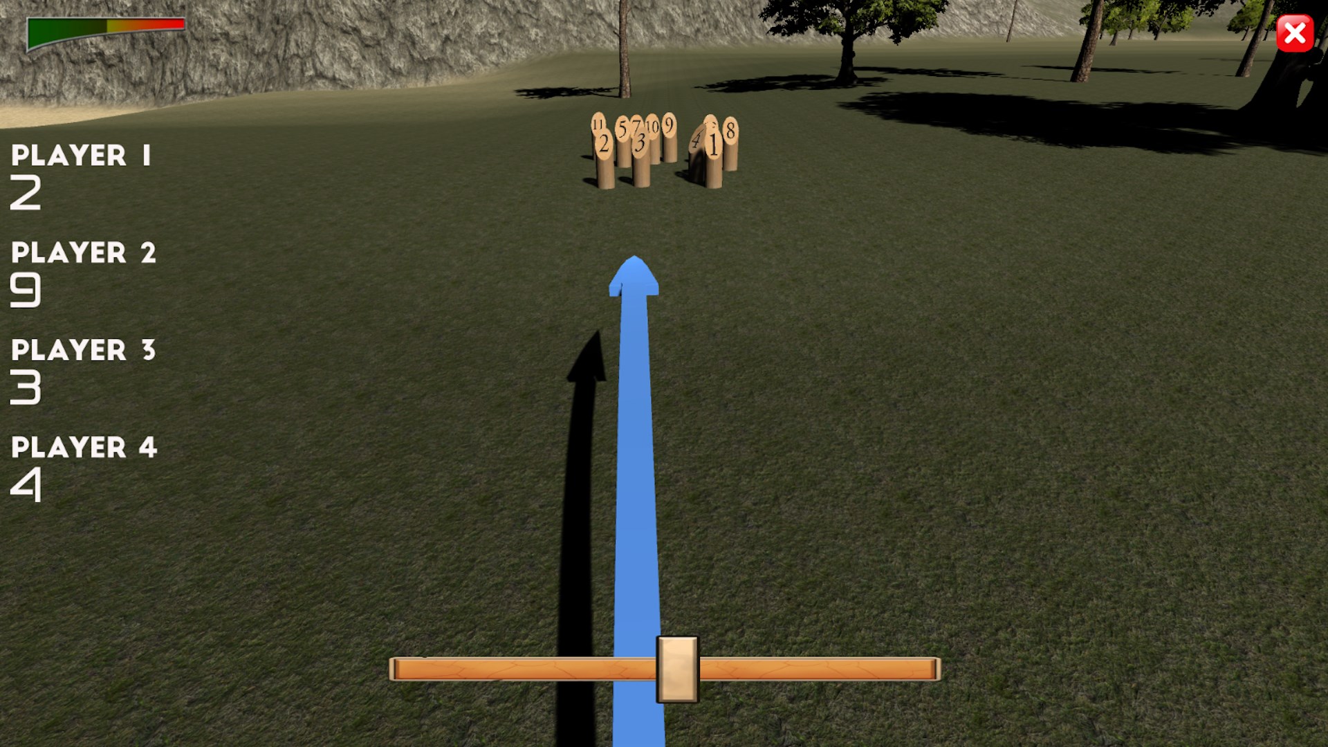 The player throws the stick into the pins. The player's score depends on the number of pins knocked down: